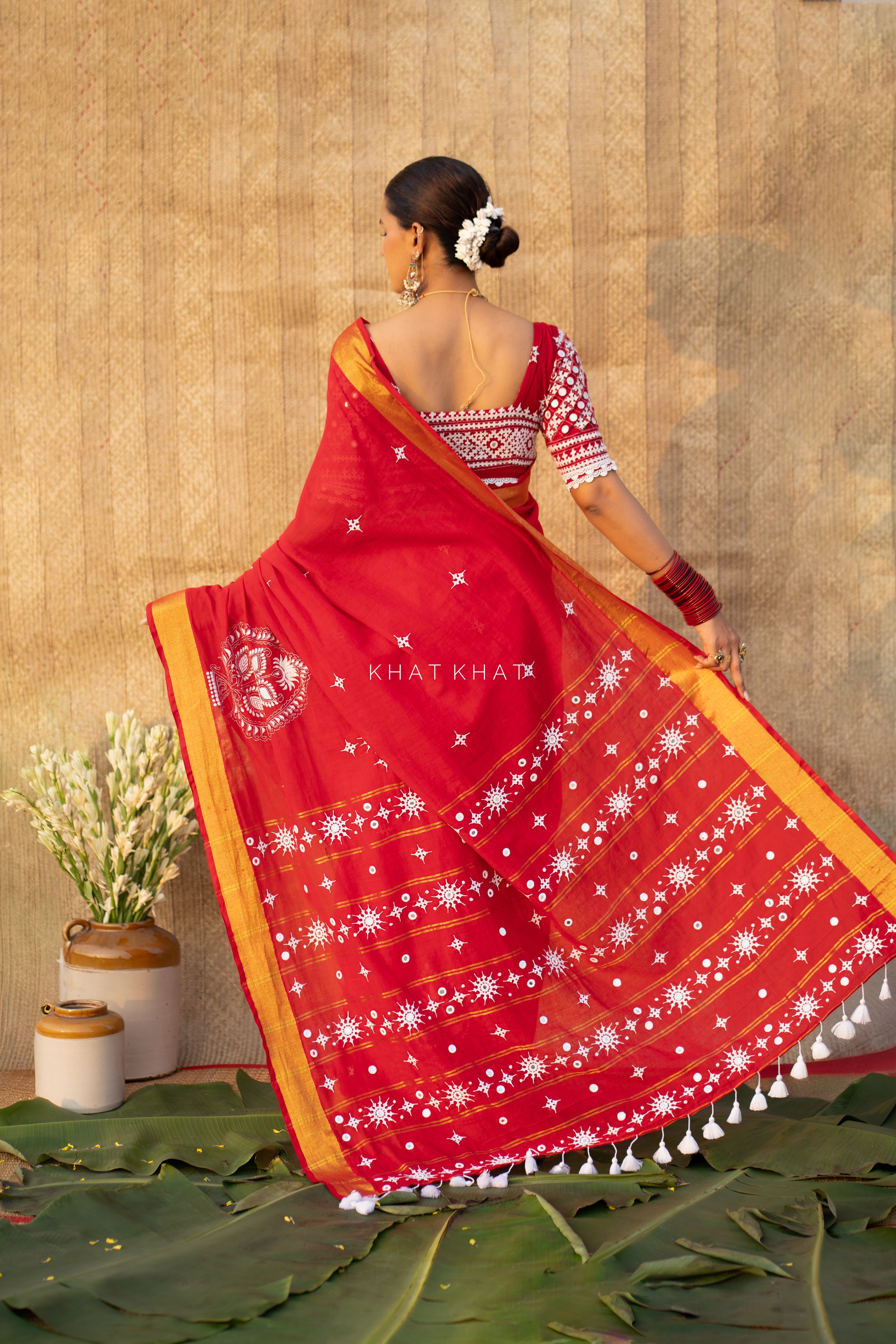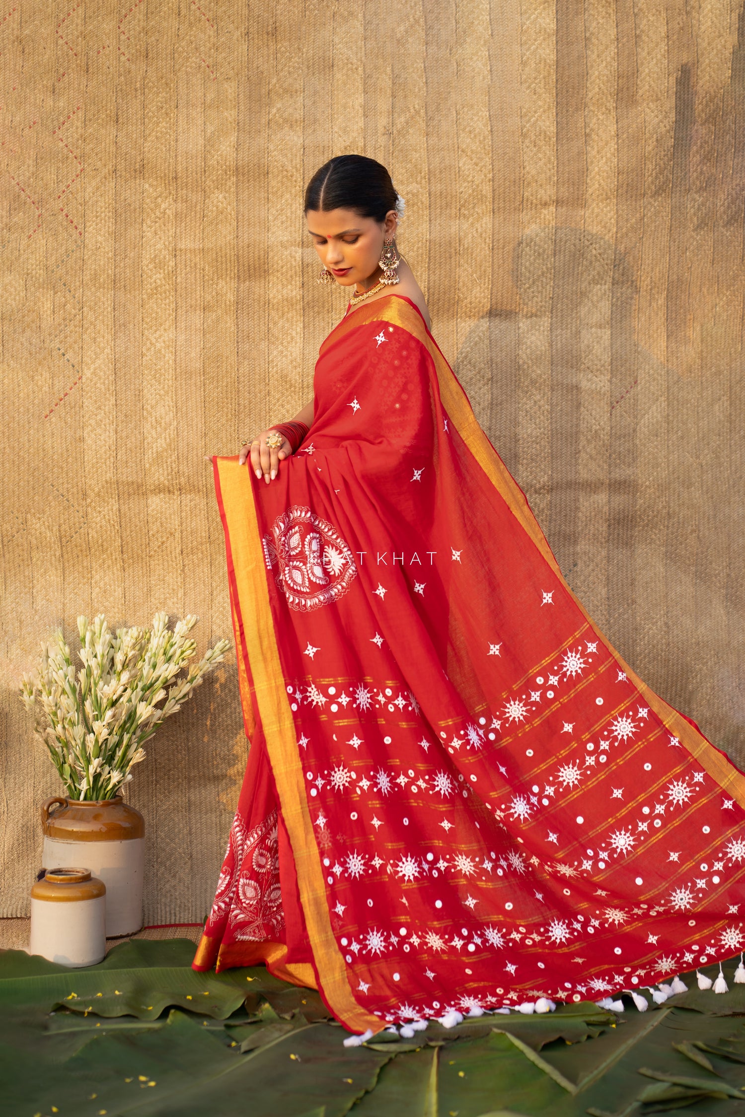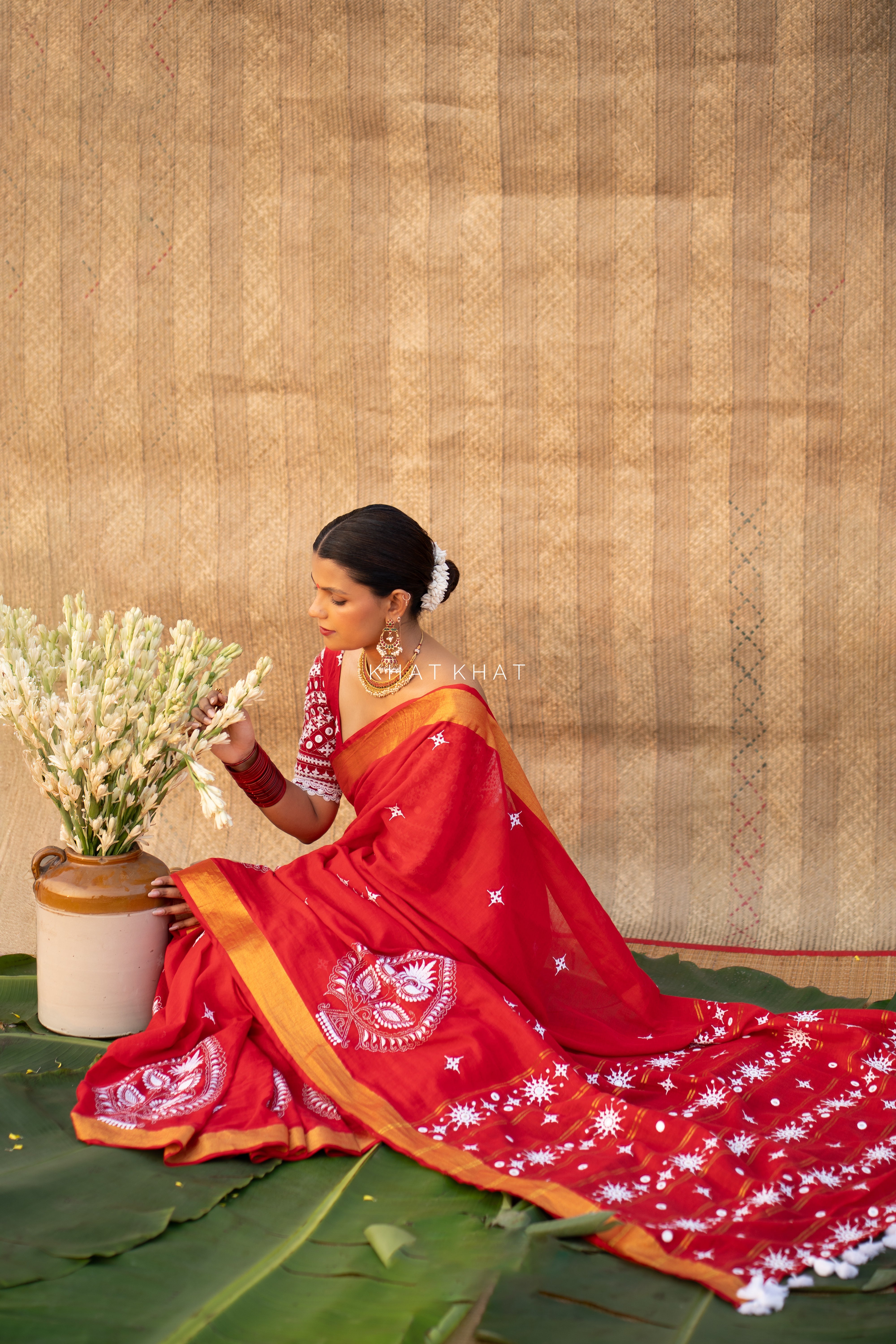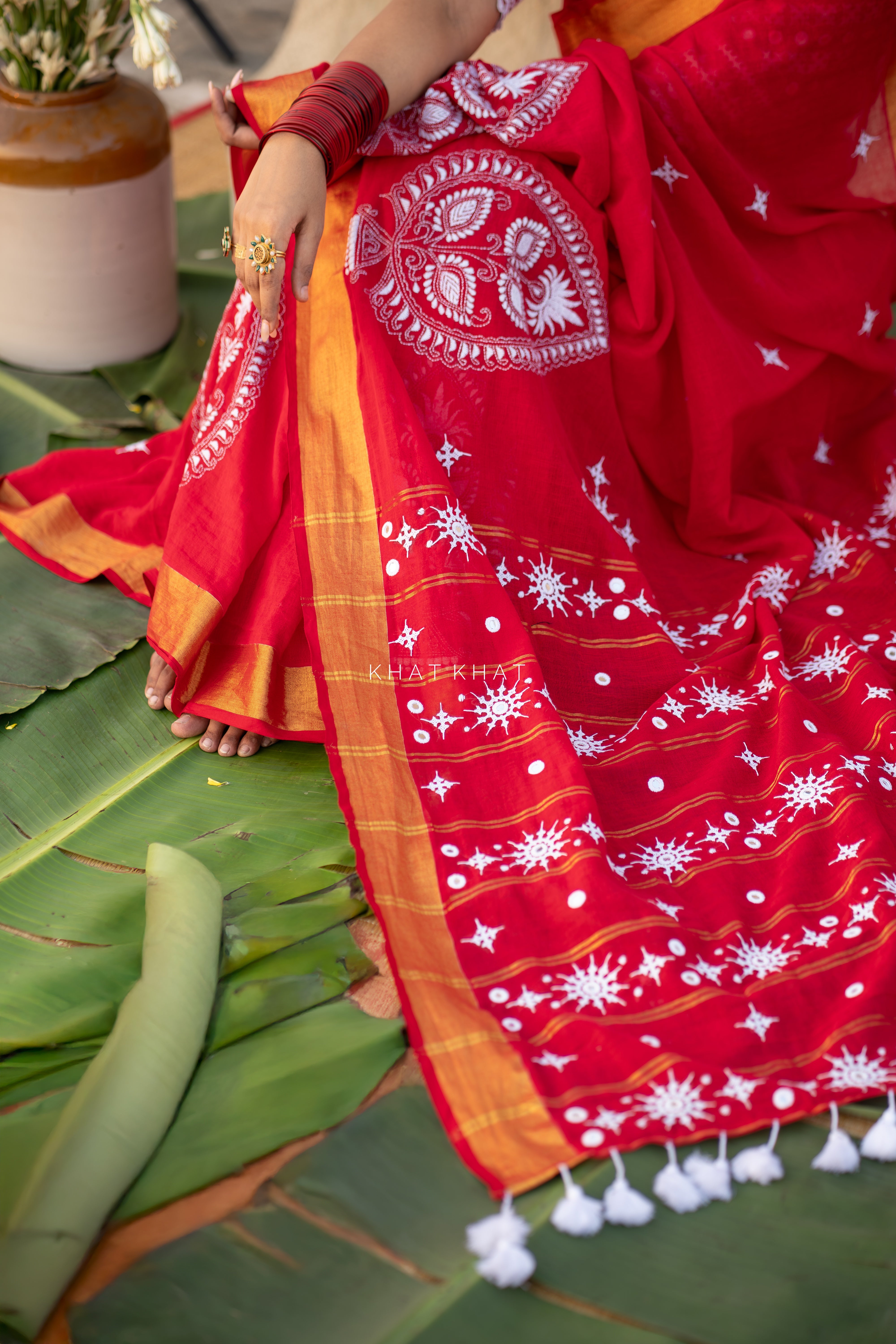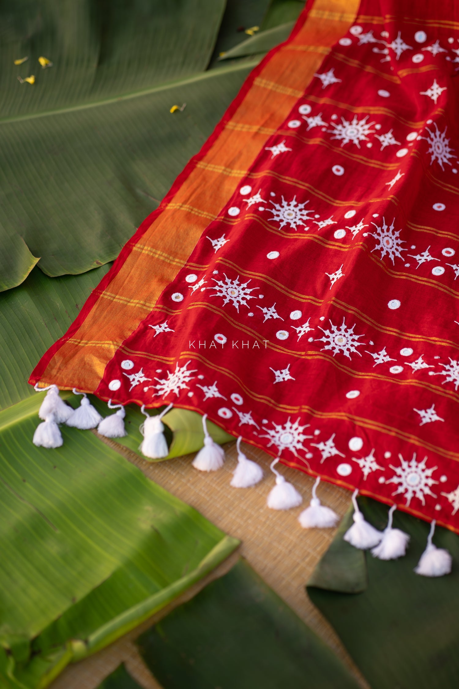 KHAT KHAT sarees are handcrafted using age-old weaving techniques passed down through generations. Each saree carries the essence of our artisans’ hard work and emotional connection to their craft, making every piece unique and full of character.