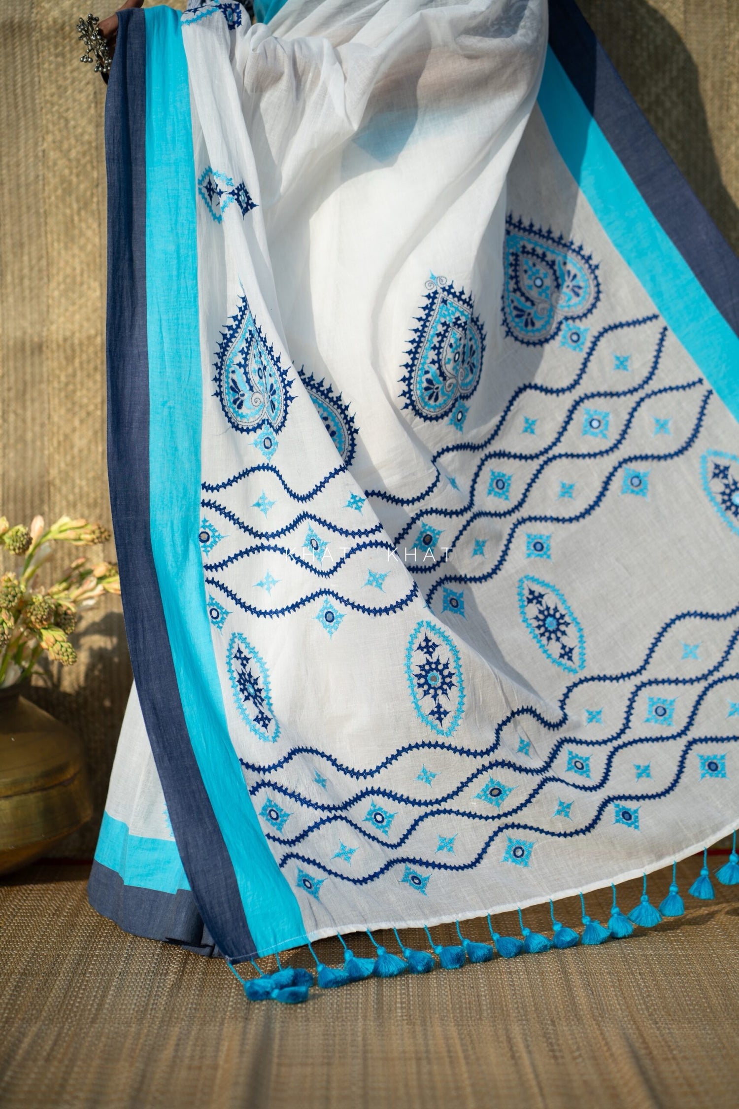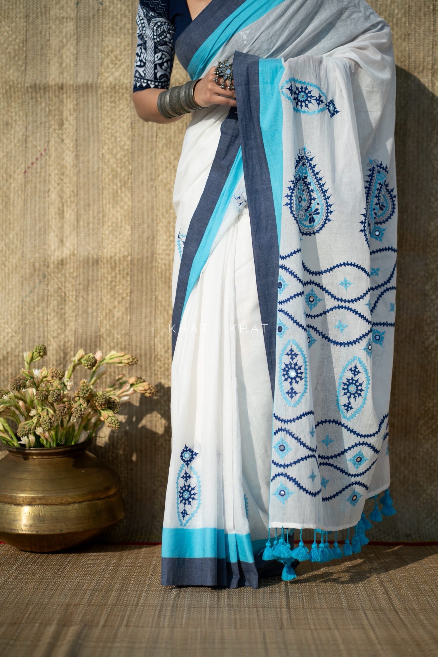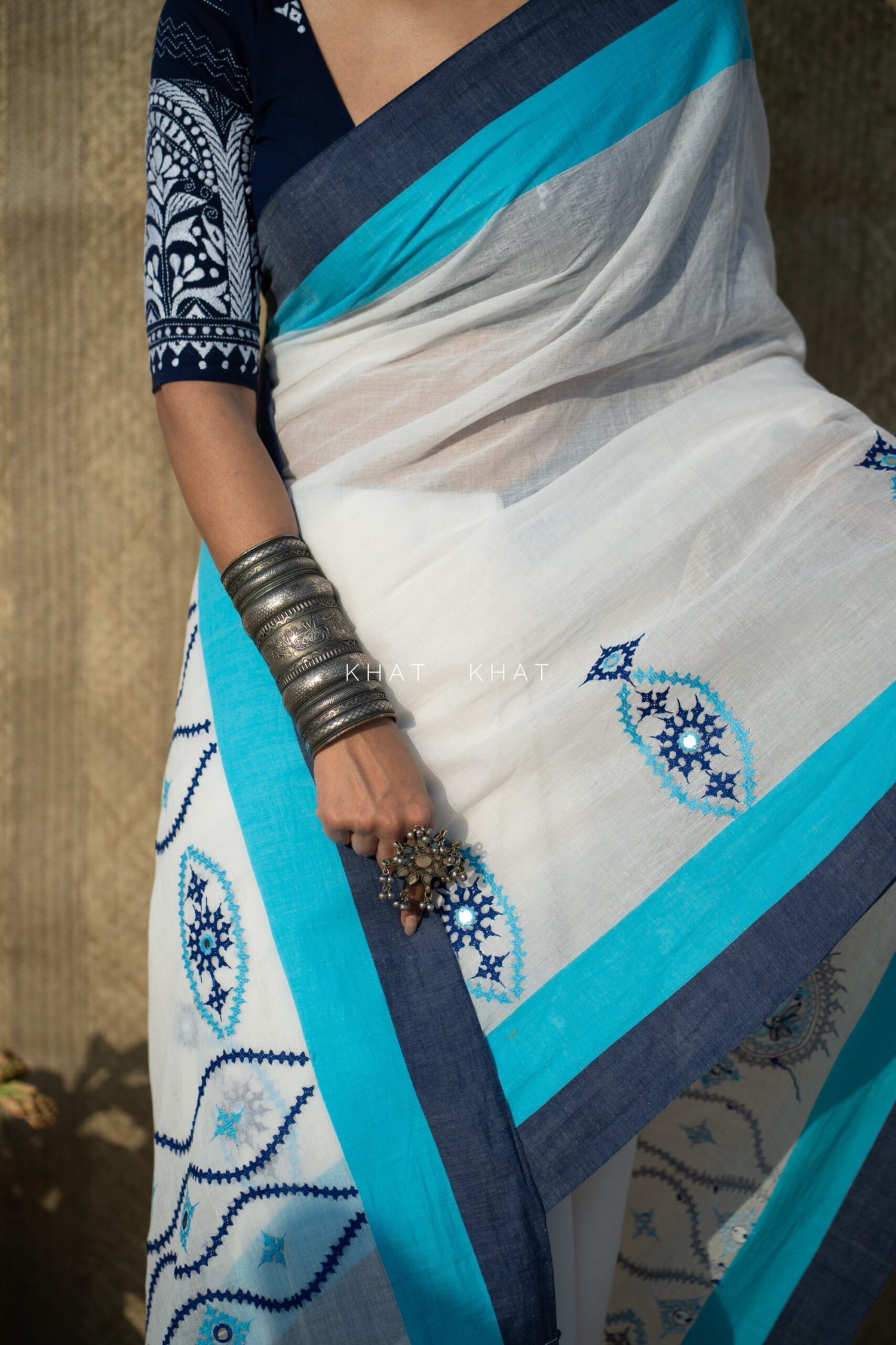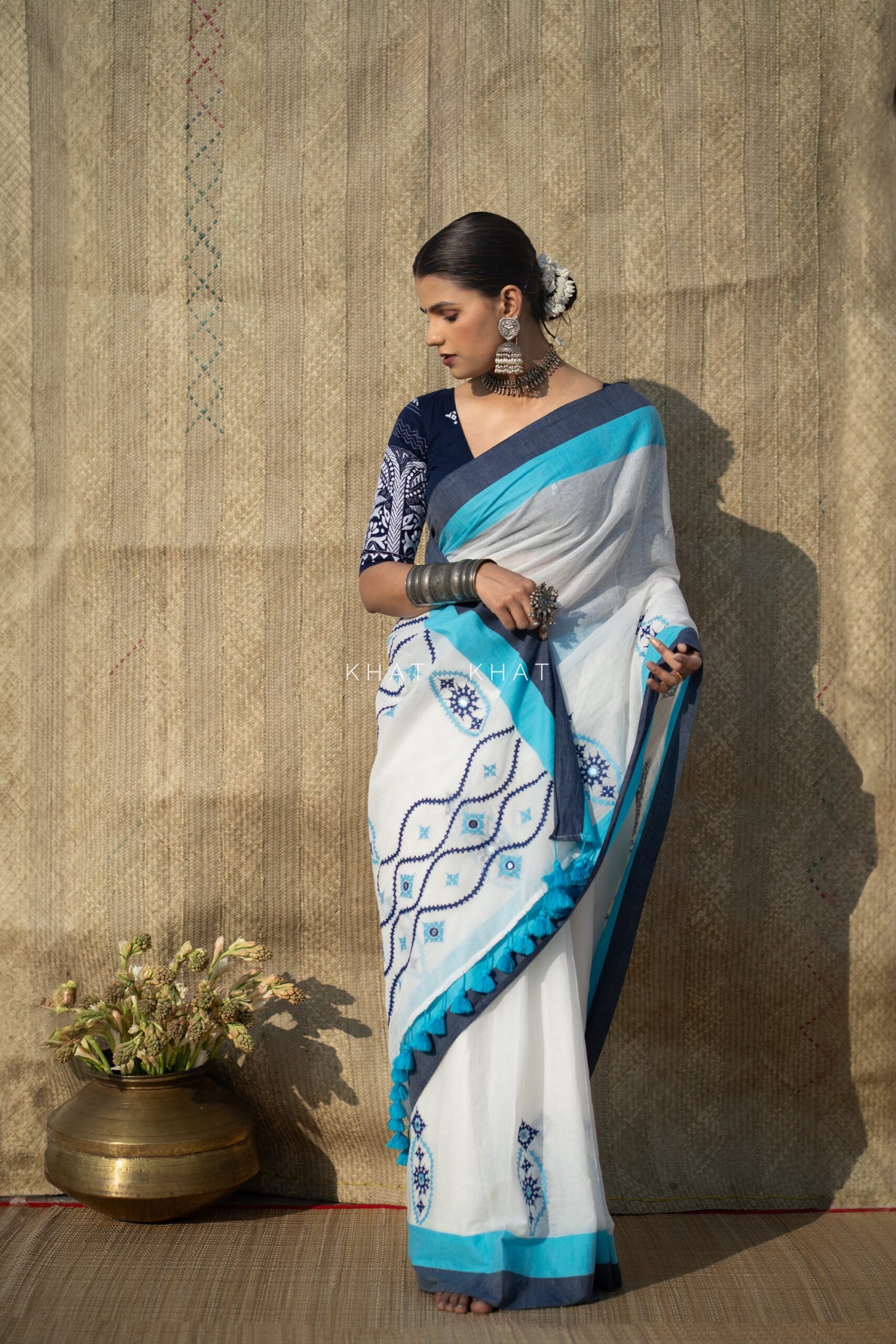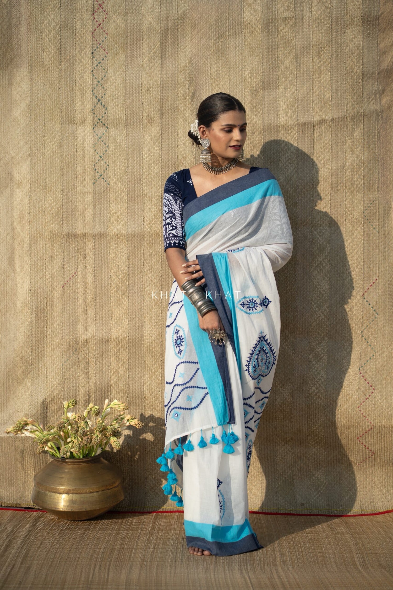 KHAT KHAT sarees are handcrafted using age-old weaving techniques passed down through generations. Each saree carries the essence of our artisans’ hard work and emotional connection to their craft, making every piece unique and full of character.