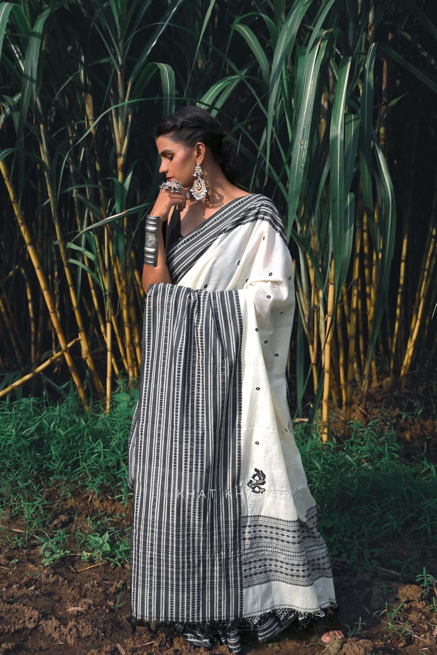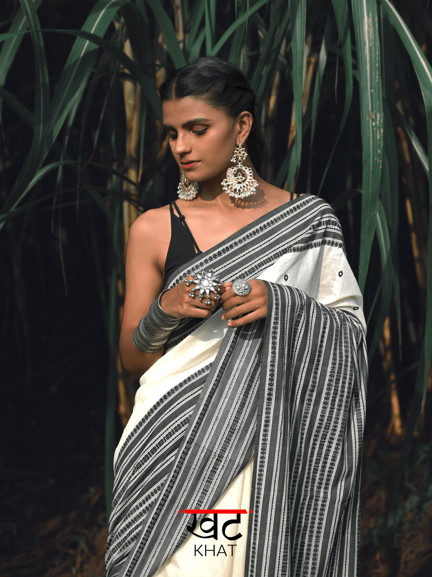 KHAT KHAT sarees are handcrafted using age-old weaving techniques passed down through generations. Each saree carries the essence of our artisans’ hard work and emotional connection to their craft, making every piece unique and full of character.