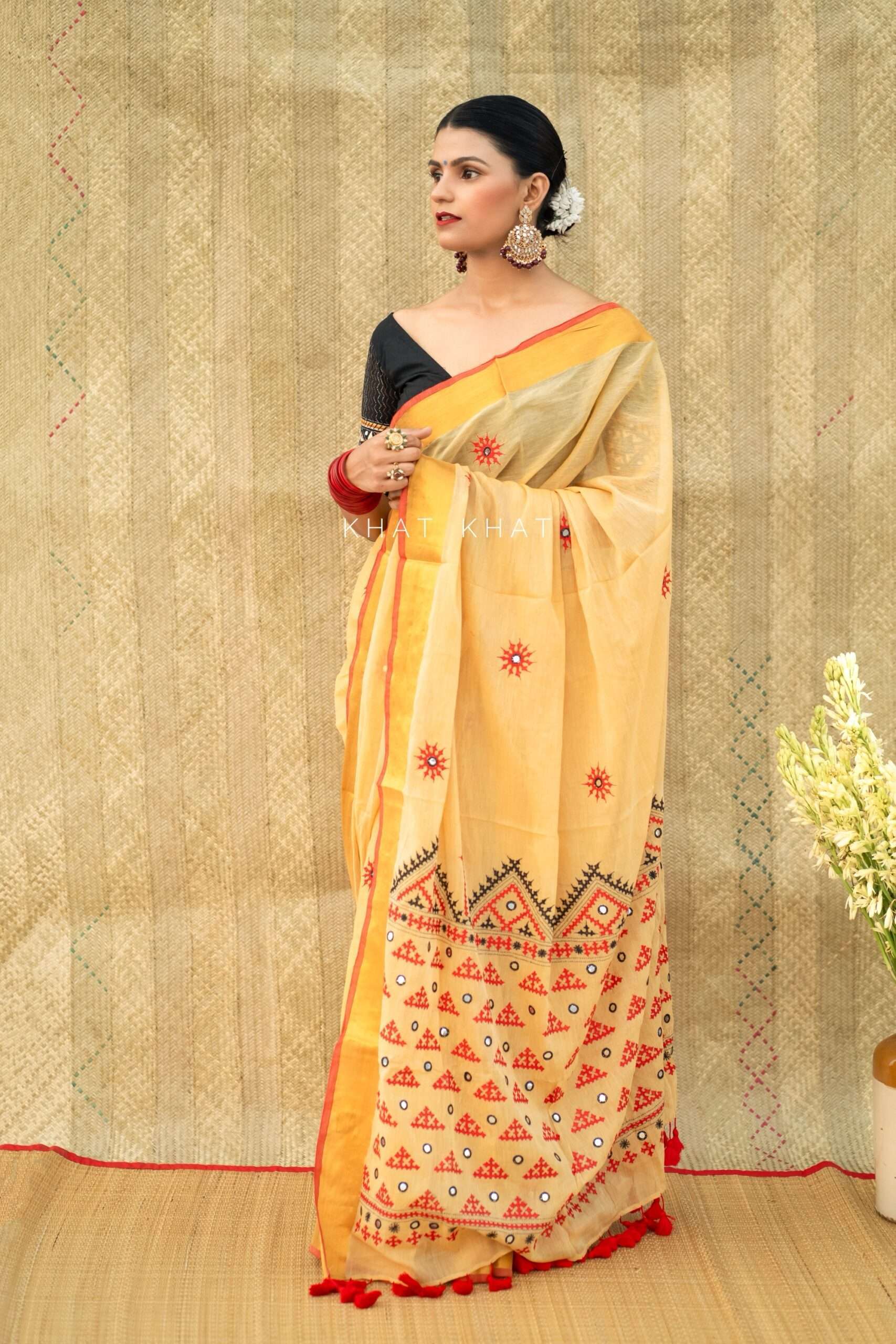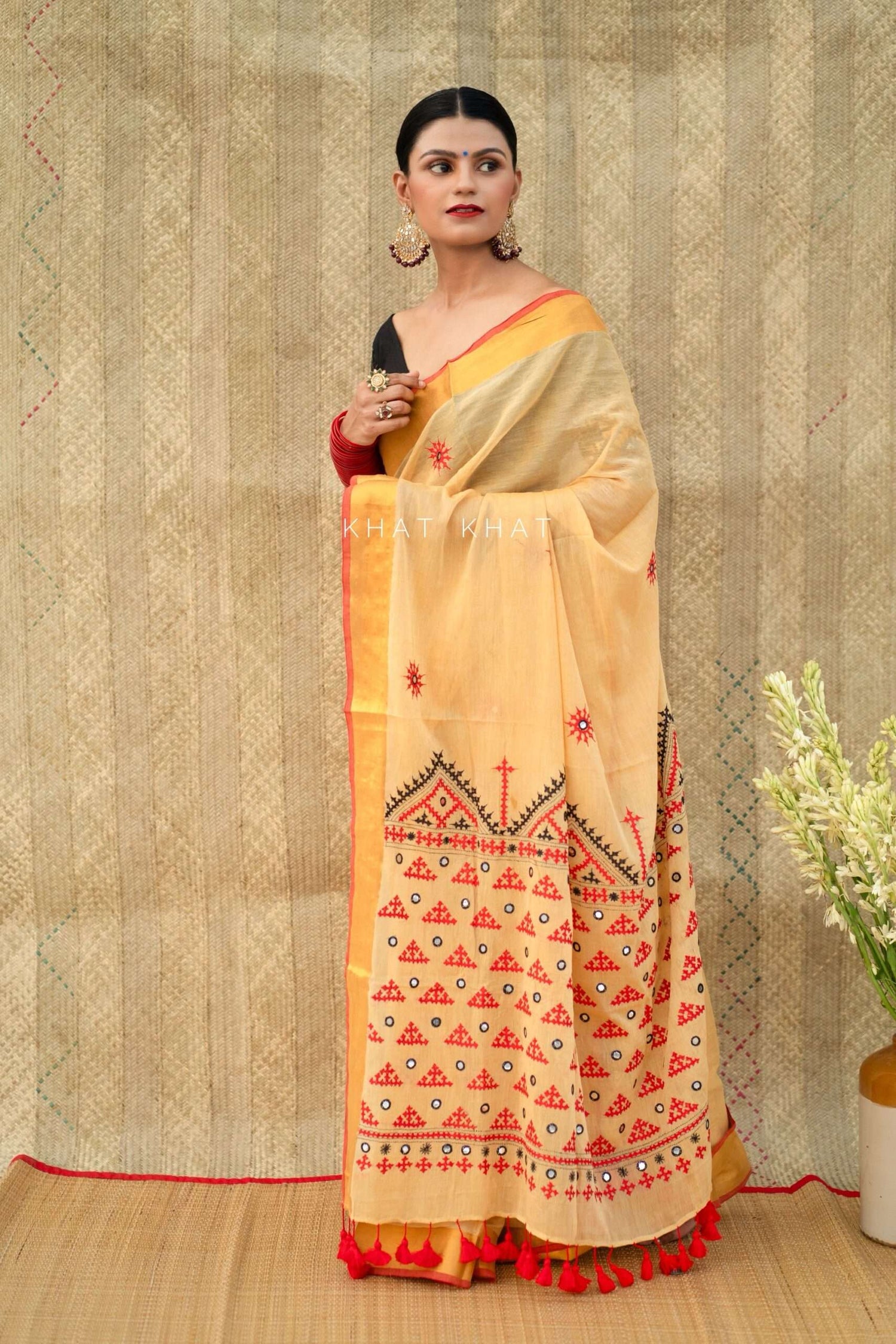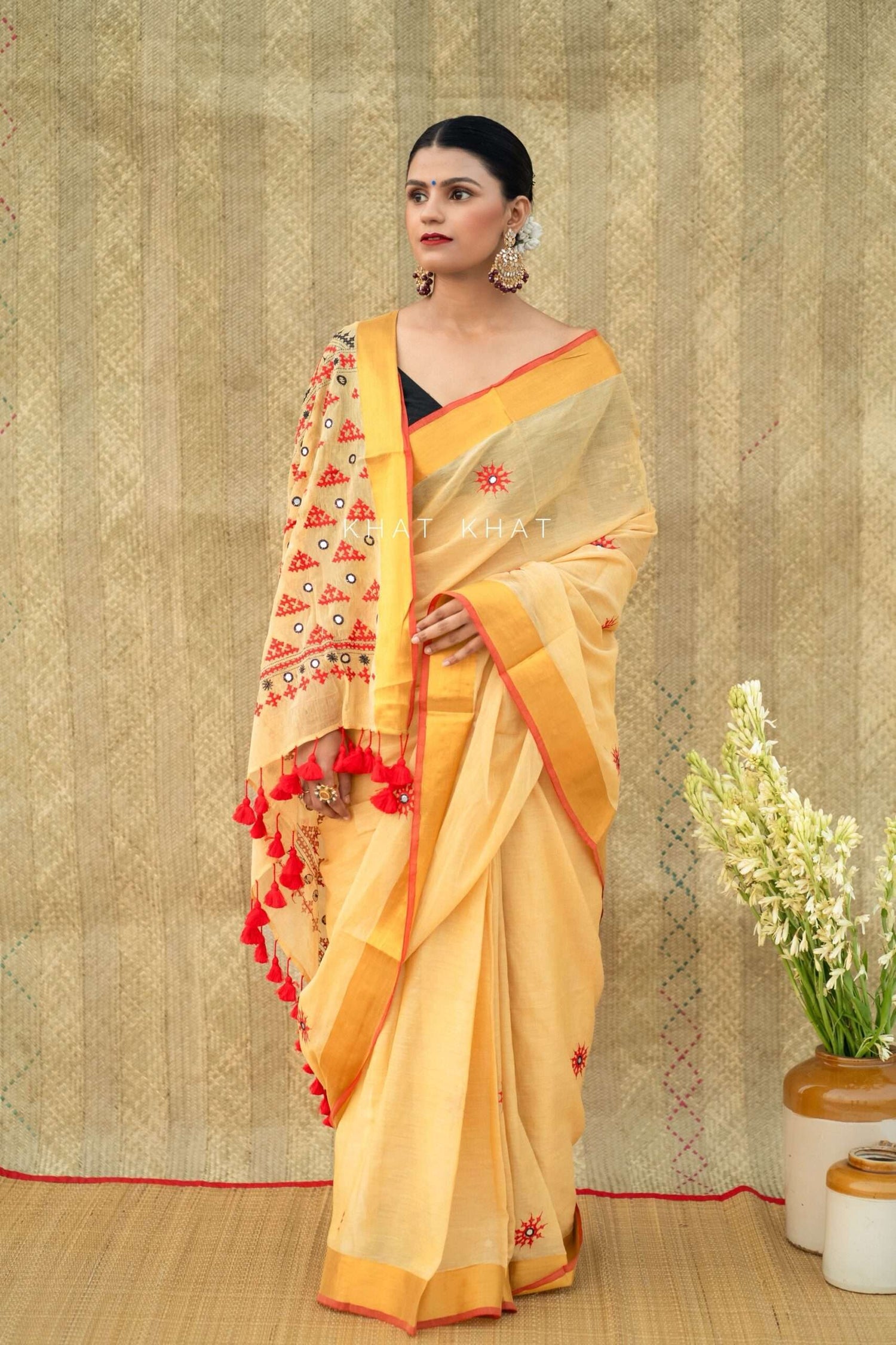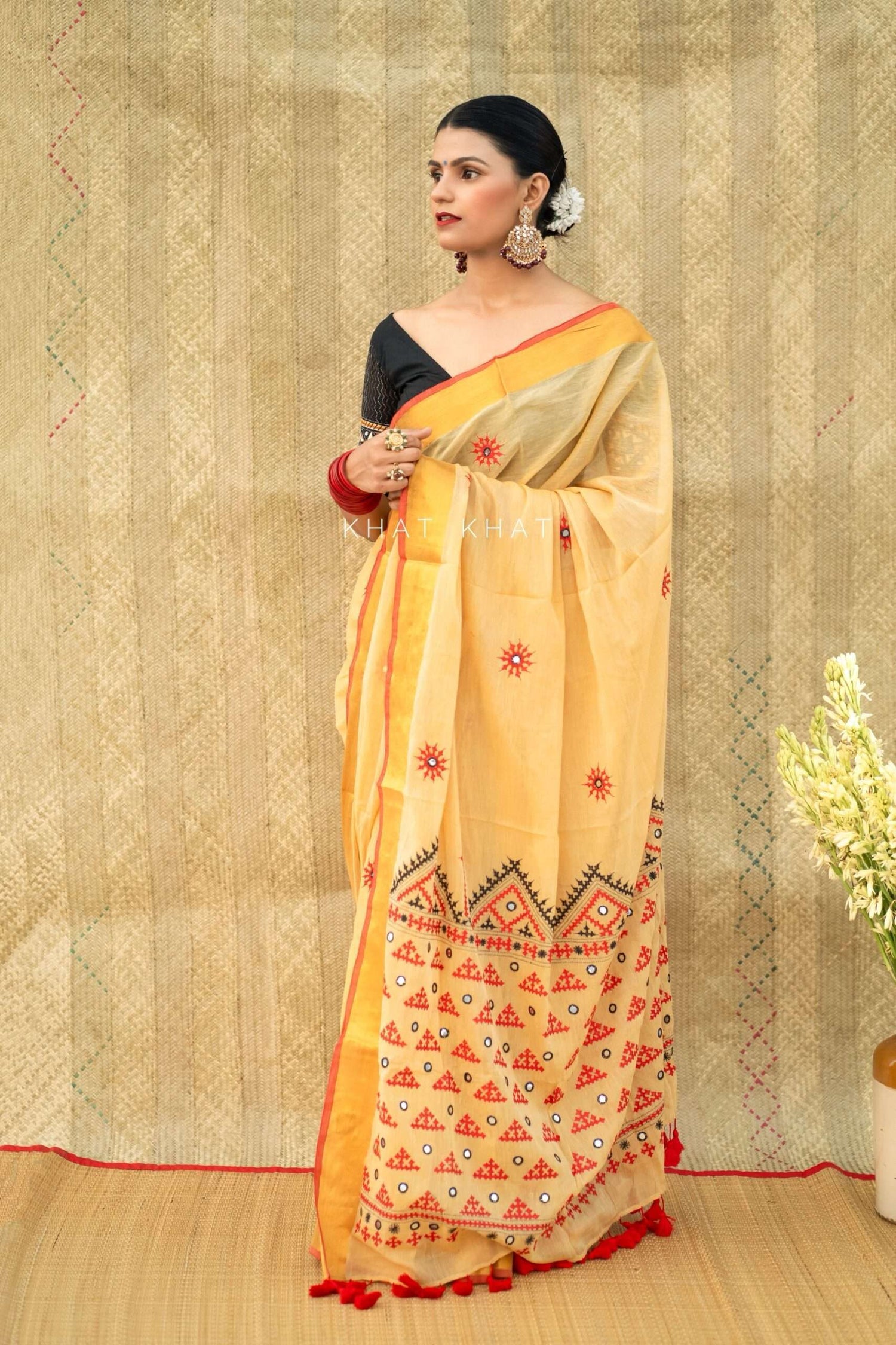 KHAT KHAT sarees are handcrafted using age-old weaving techniques passed down through generations. Each saree carries the essence of our artisans’ hard work and emotional connection to their craft, making every piece unique and full of character.