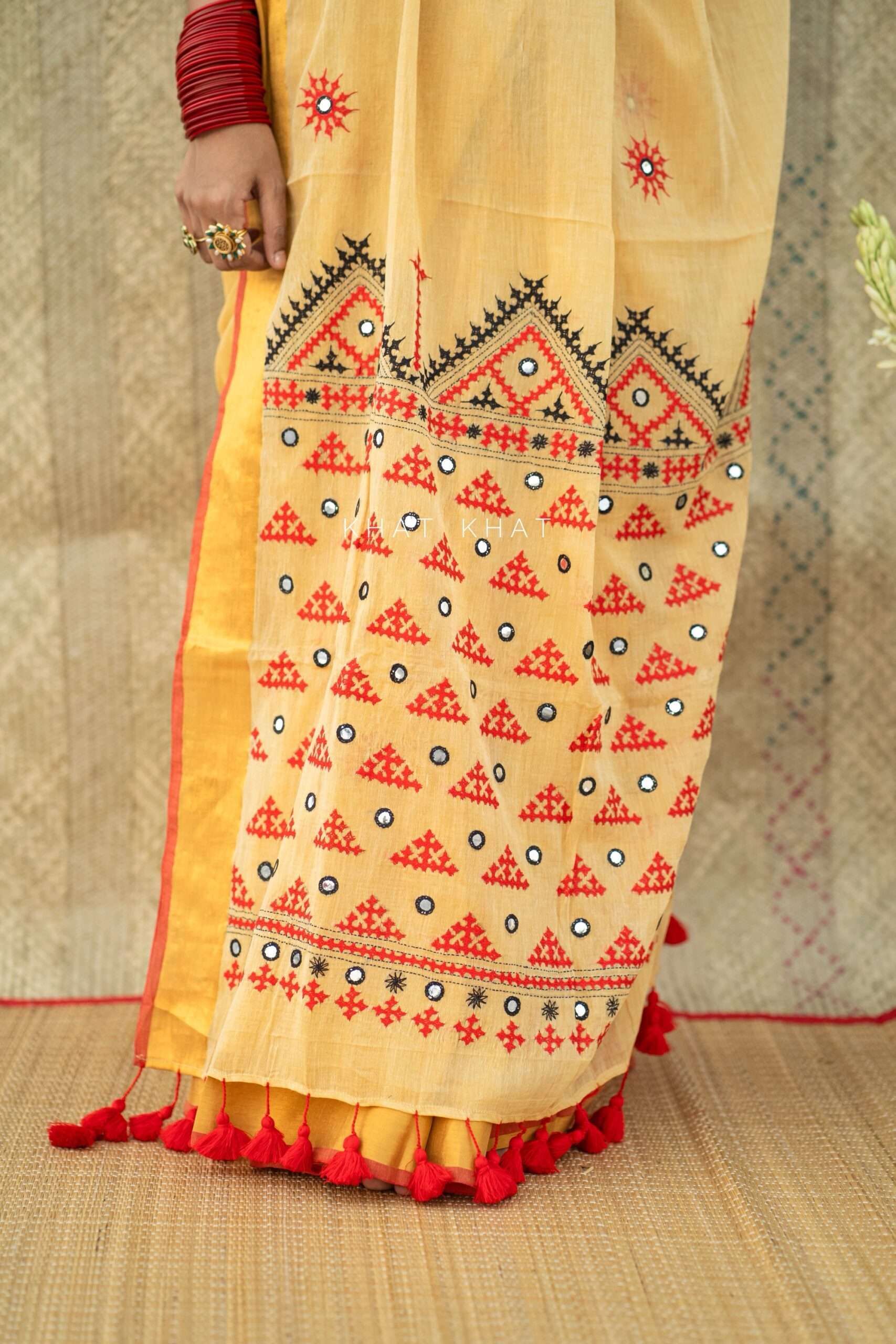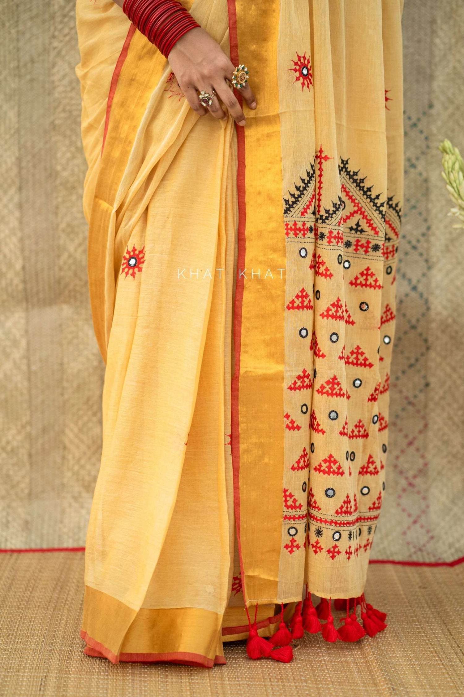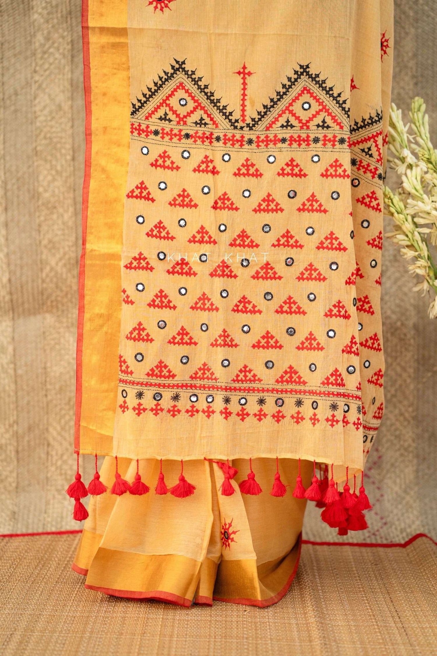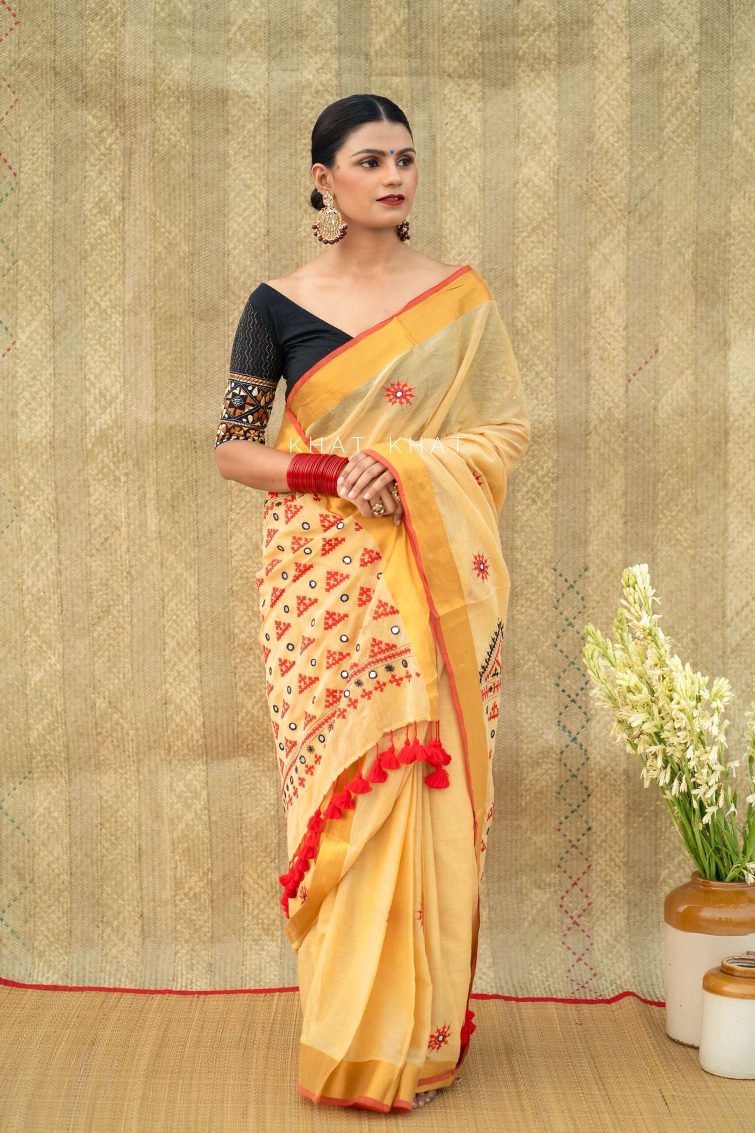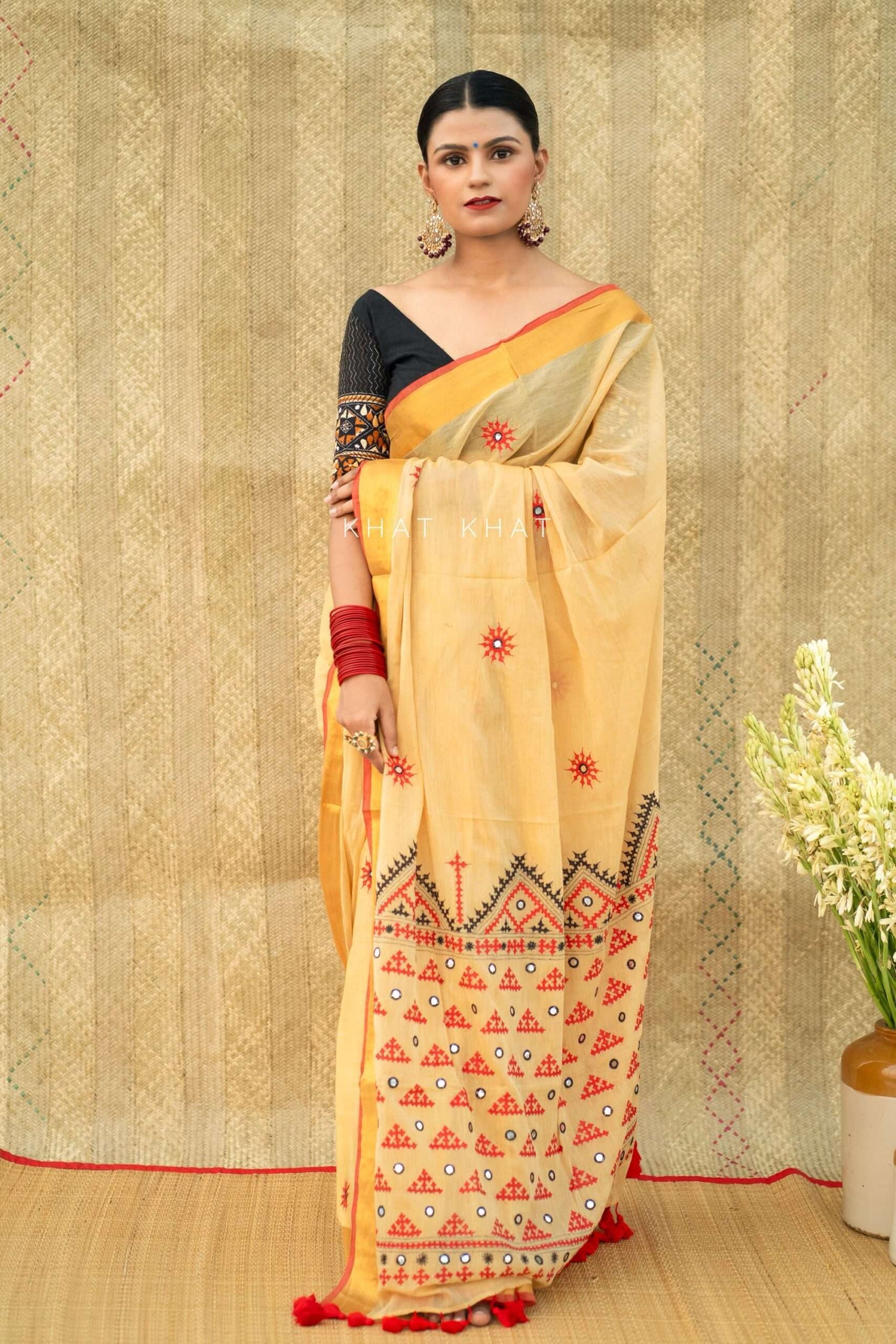 KHAT KHAT sarees are handcrafted using age-old weaving techniques passed down through generations. Each saree carries the essence of our artisans’ hard work and emotional connection to their craft, making every piece unique and full of character.