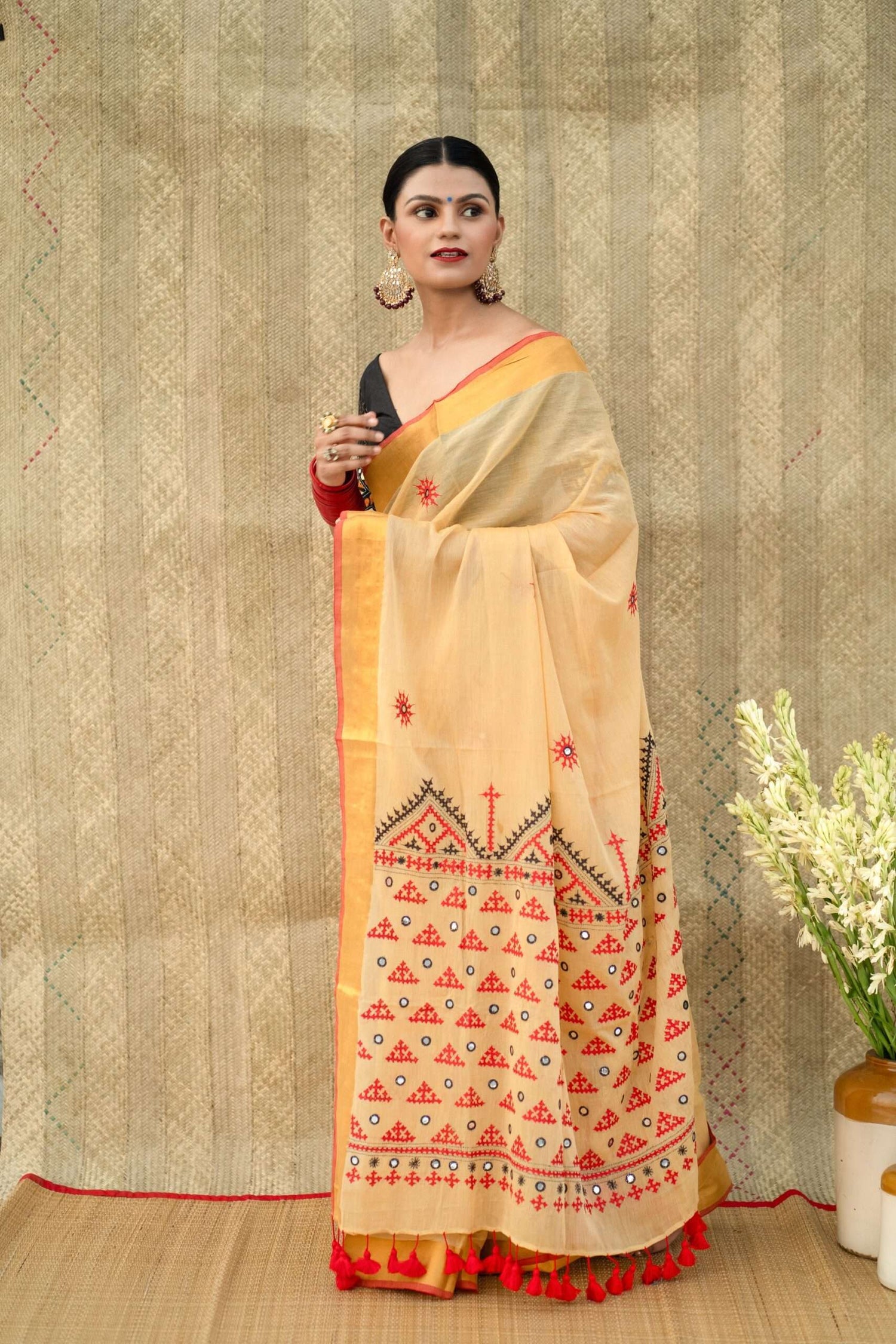 Our sarees are made from completely organic fabrics such as pure cotton, silk, and linen. Every piece is handwoven by indigenous artisans, ensuring a blend of tradition, quality, and sustainability.