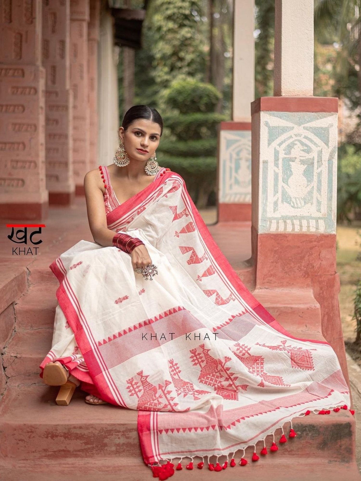 KHAT KHAT sarees are handcrafted using age-old weaving techniques passed down through generations. Each saree carries the essence of our artisans’ hard work and emotional connection to their craft, making every piece unique and full of character.