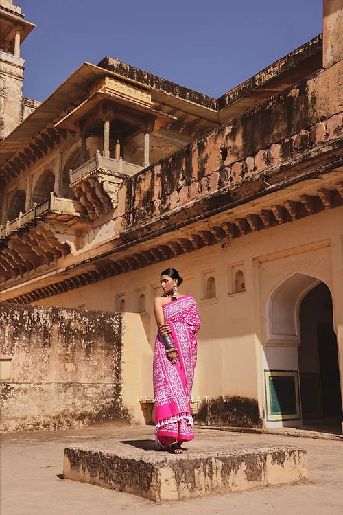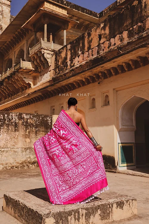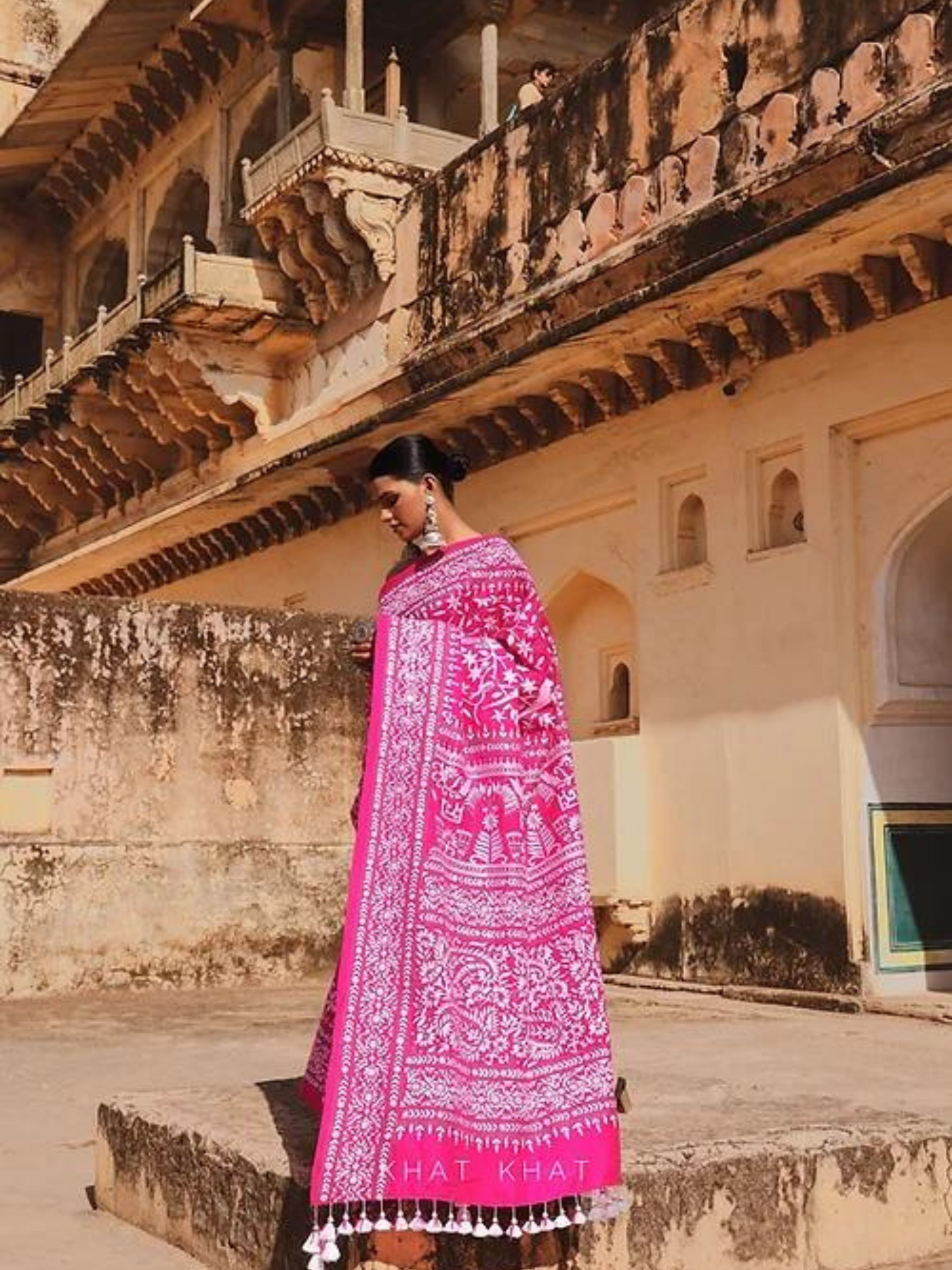 KHAT KHAT sarees are handcrafted using age-old weaving techniques passed down through generations. Each saree carries the essence of our artisans’ hard work and emotional connection to their craft, making every piece unique and full of character.