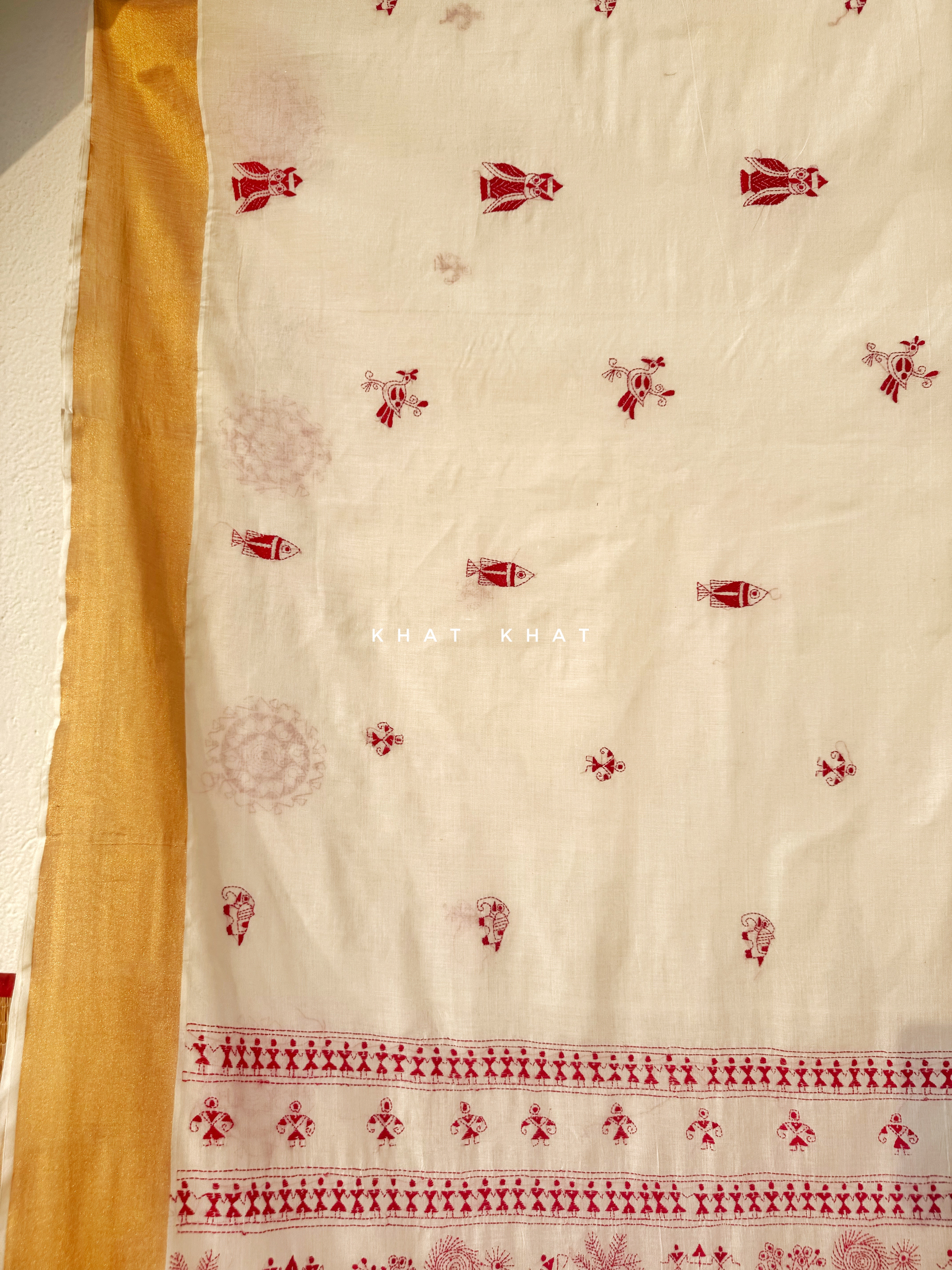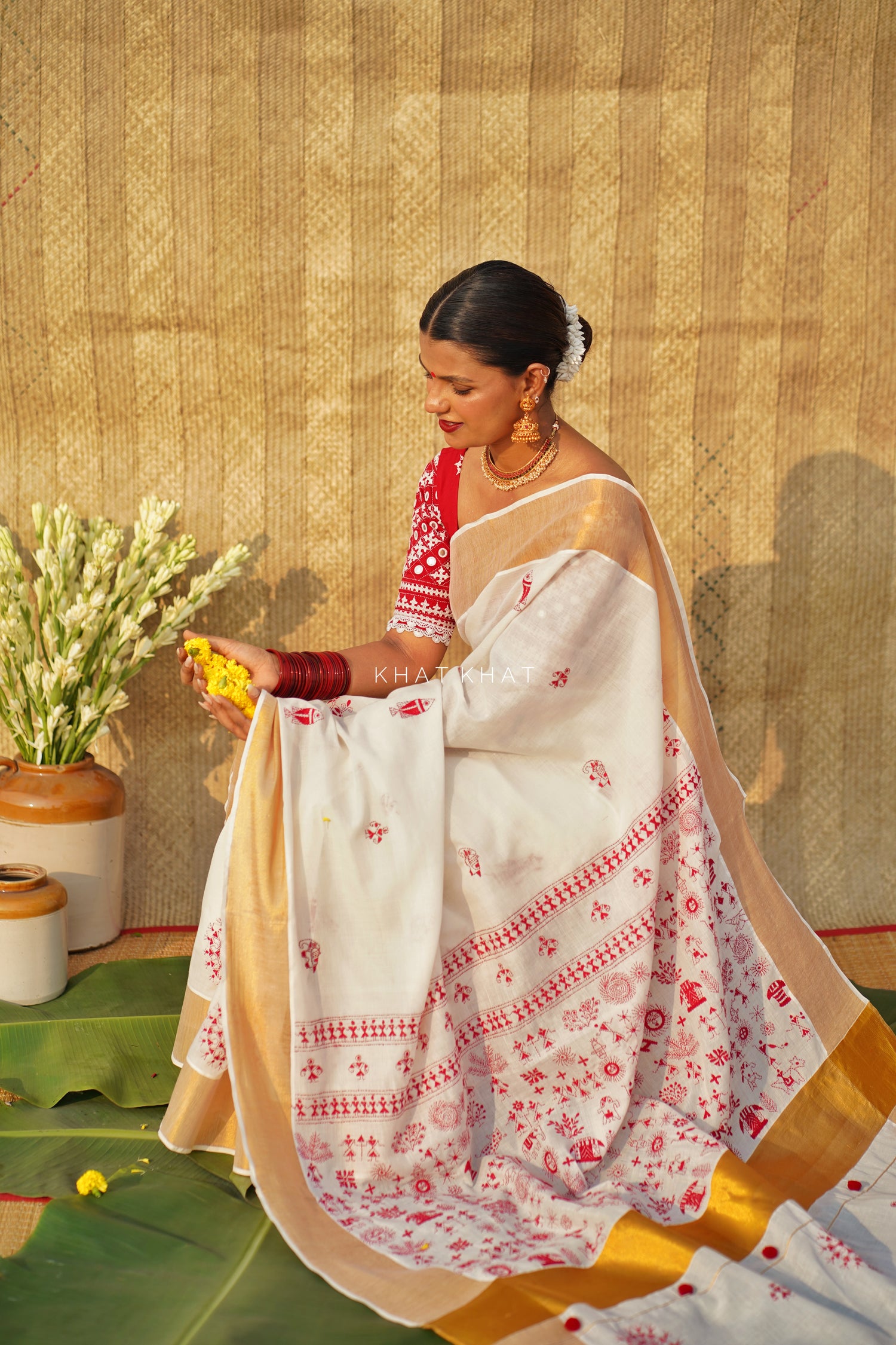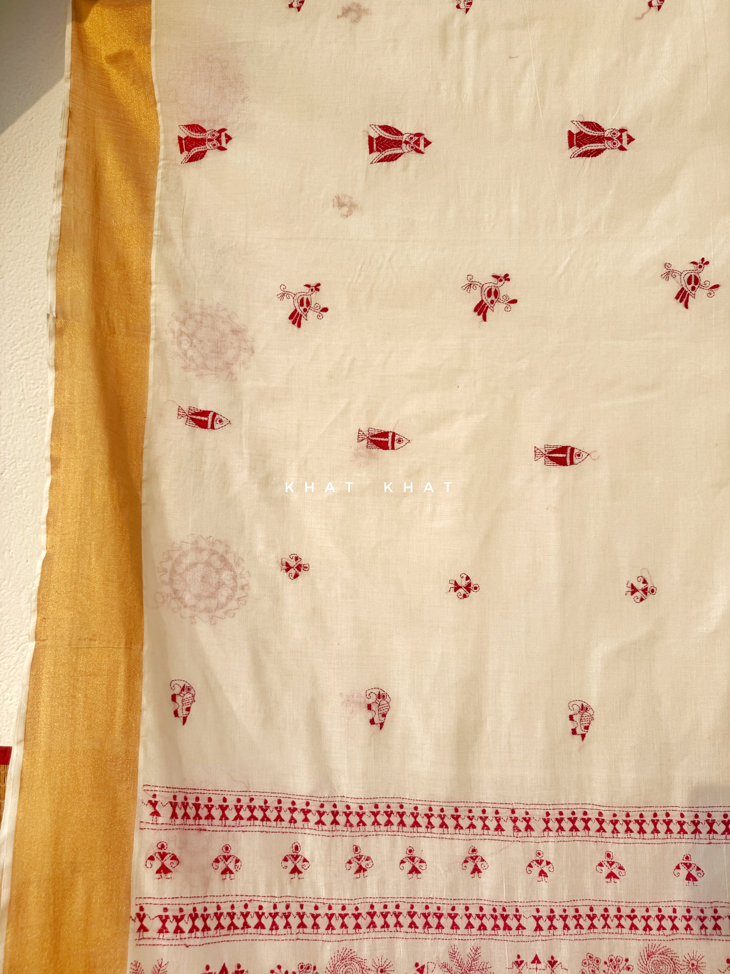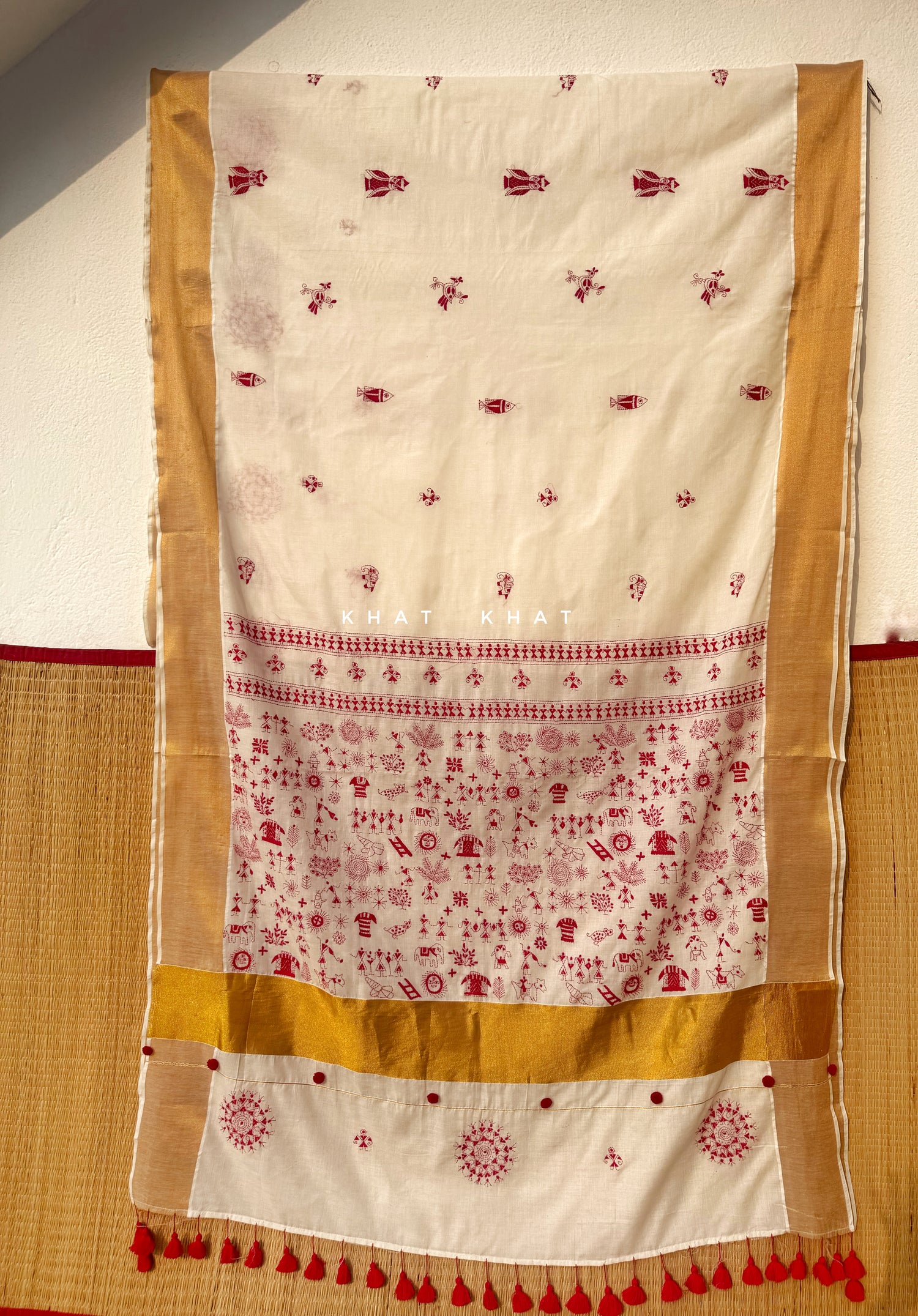 KHAT KHAT sarees are handcrafted using age-old weaving techniques passed down through generations. Each saree carries the essence of our artisans’ hard work and emotional connection to their craft, making every piece unique and full of character.