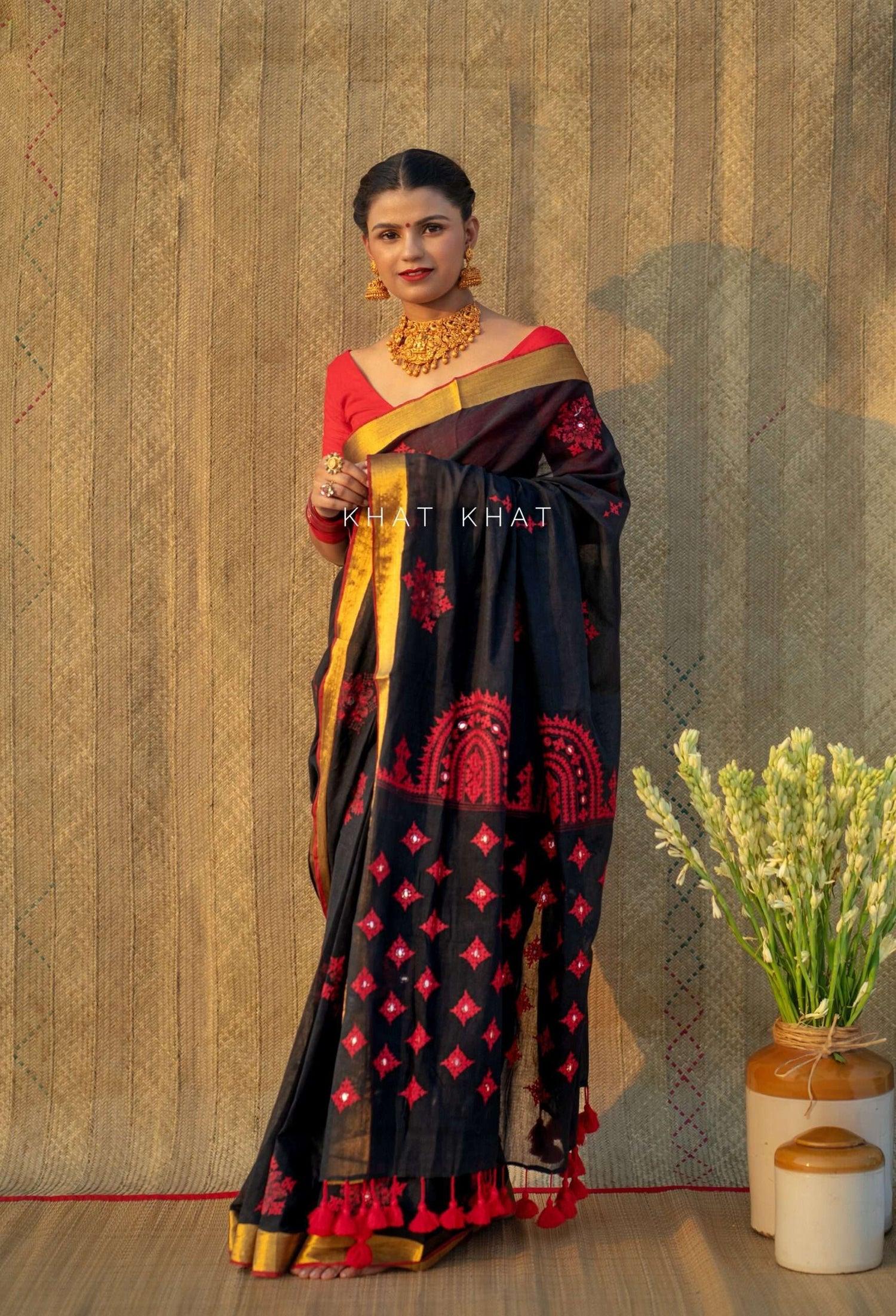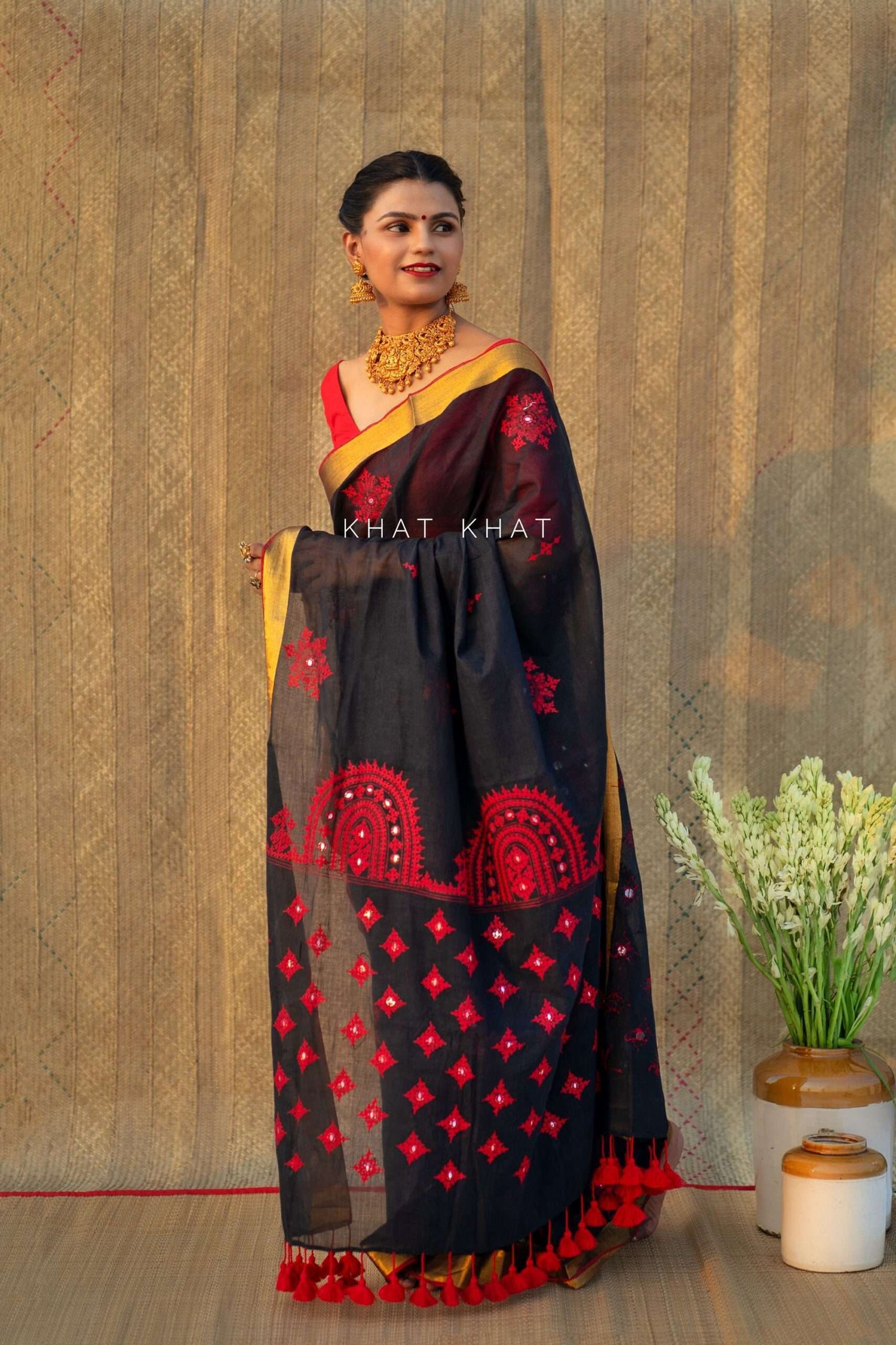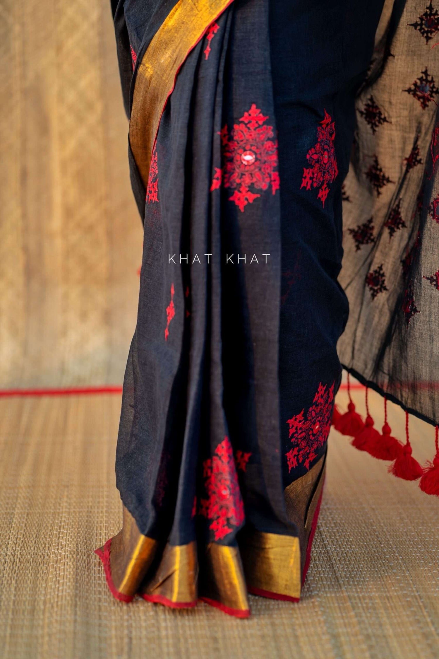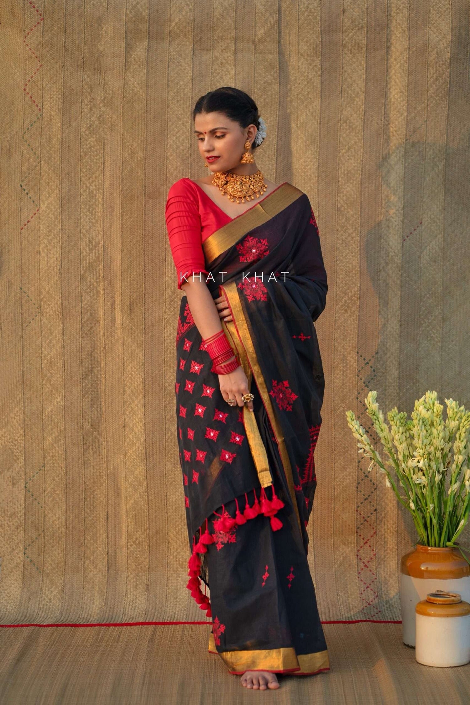 KHAT KHAT sarees are handcrafted using age-old weaving techniques passed down through generations. Each saree carries the essence of our artisans’ hard work and emotional connection to their craft, making every piece unique and full of character.