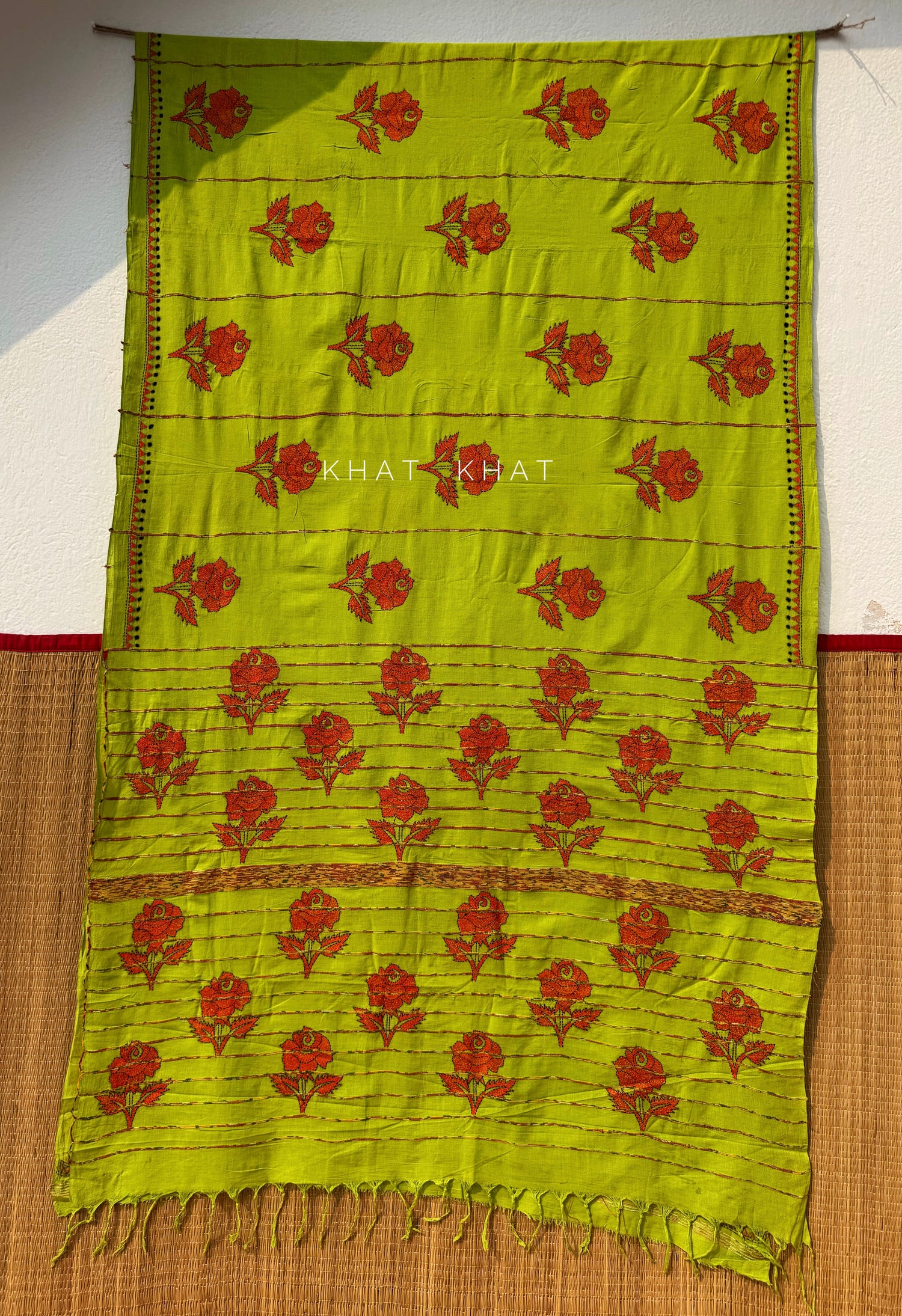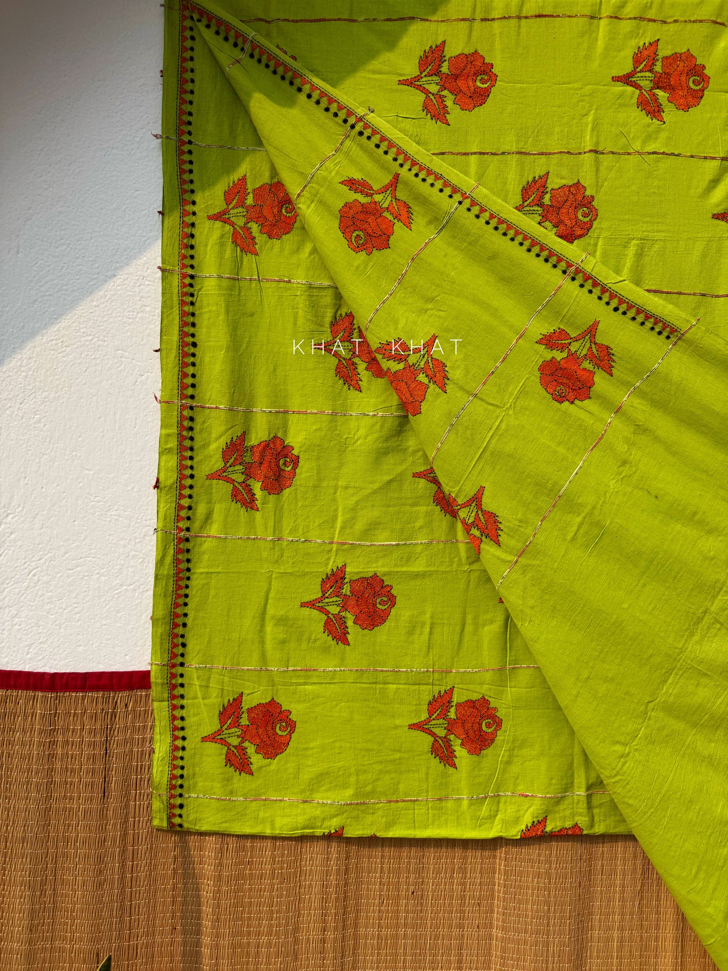 KHAT KHAT sarees are handcrafted using age-old weaving techniques passed down through generations. Each saree carries the essence of our artisans’ hard work and emotional connection to their craft, making every piece unique and full of character.