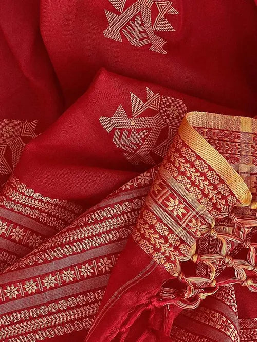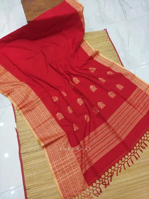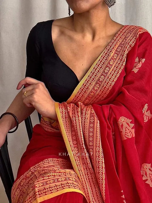 KHAT KHAT sarees are handcrafted using age-old weaving techniques passed down through generations. Each saree carries the essence of our artisans’ hard work and emotional connection to their craft, making every piece unique and full of character.