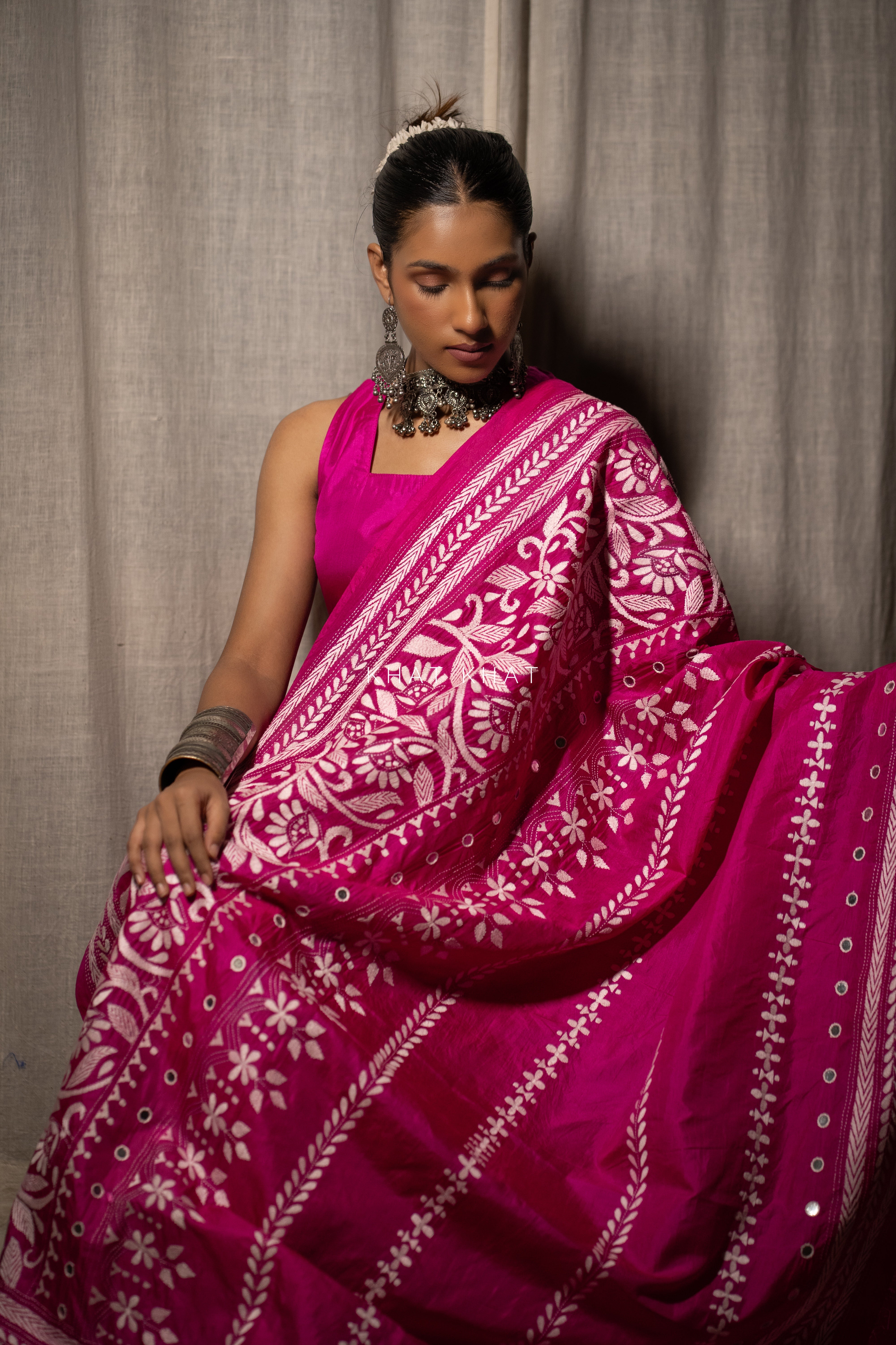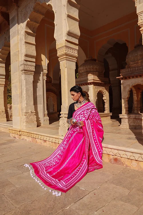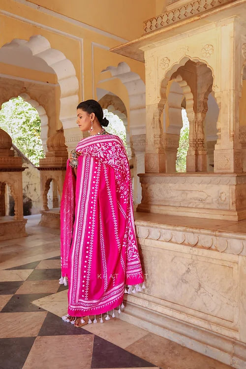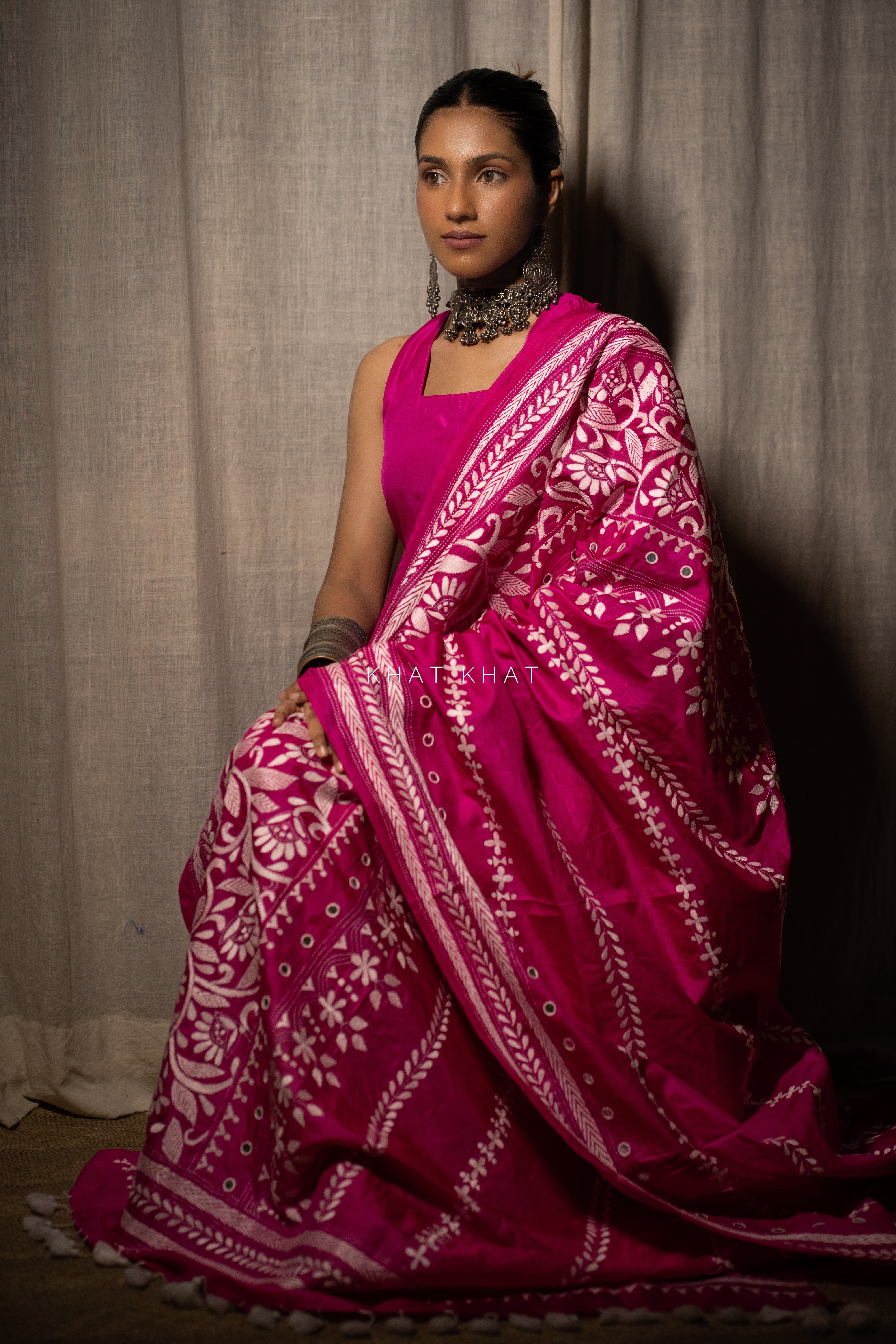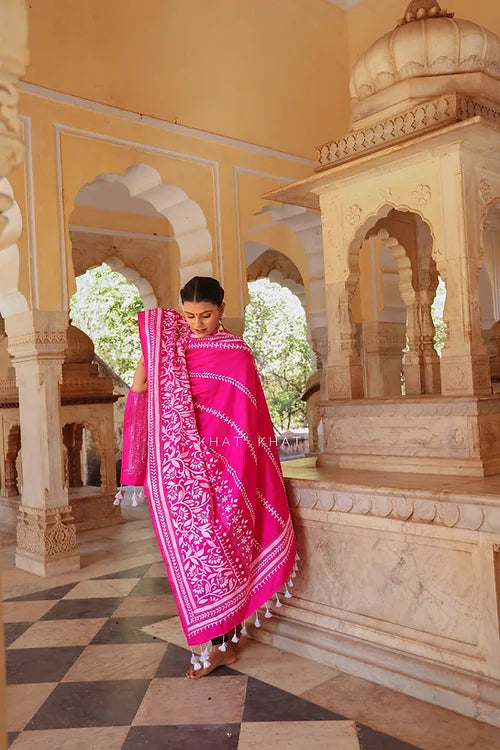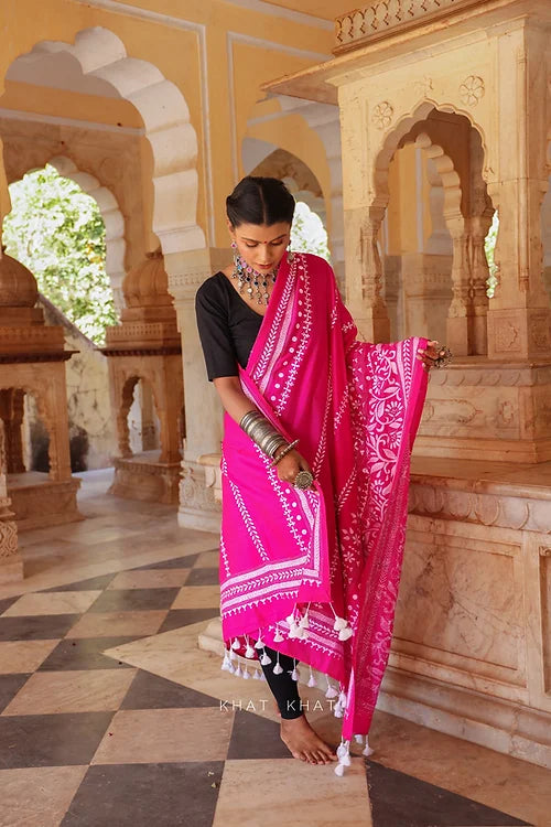 KHAT KHAT sarees are handcrafted using age-old weaving techniques passed down through generations. Each saree carries the essence of our artisans’ hard work and emotional connection to their craft, making every piece unique and full of character.