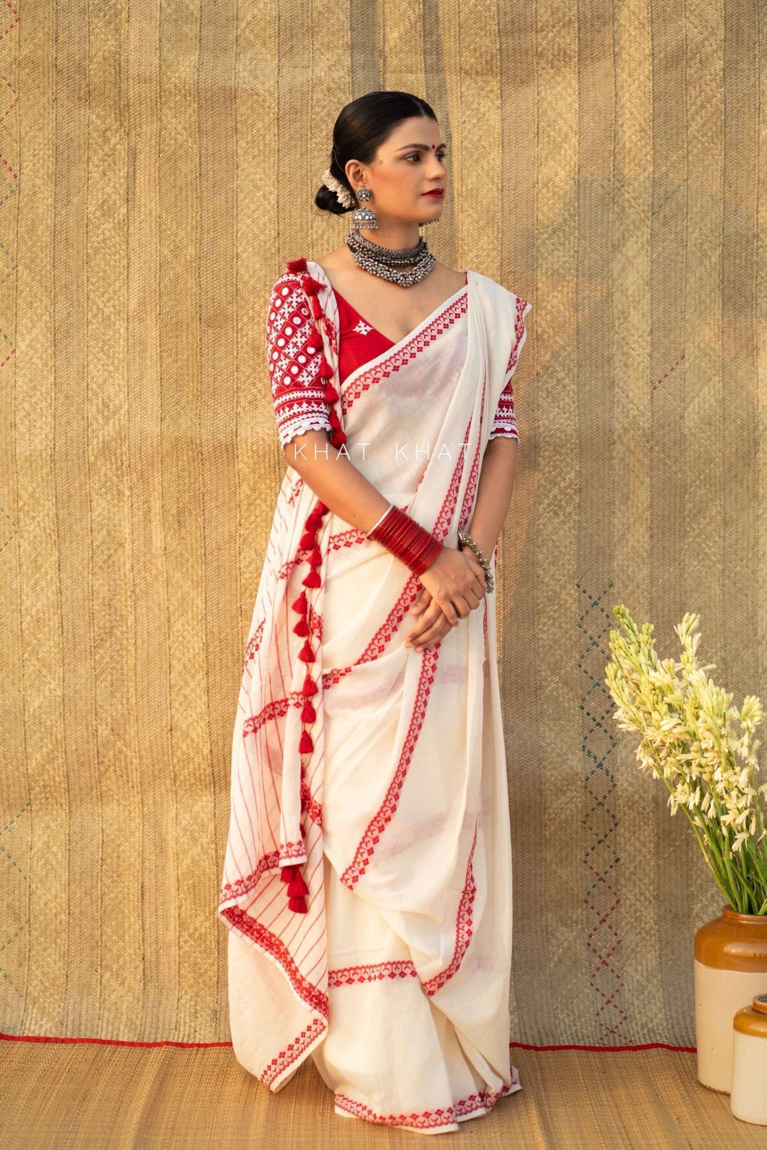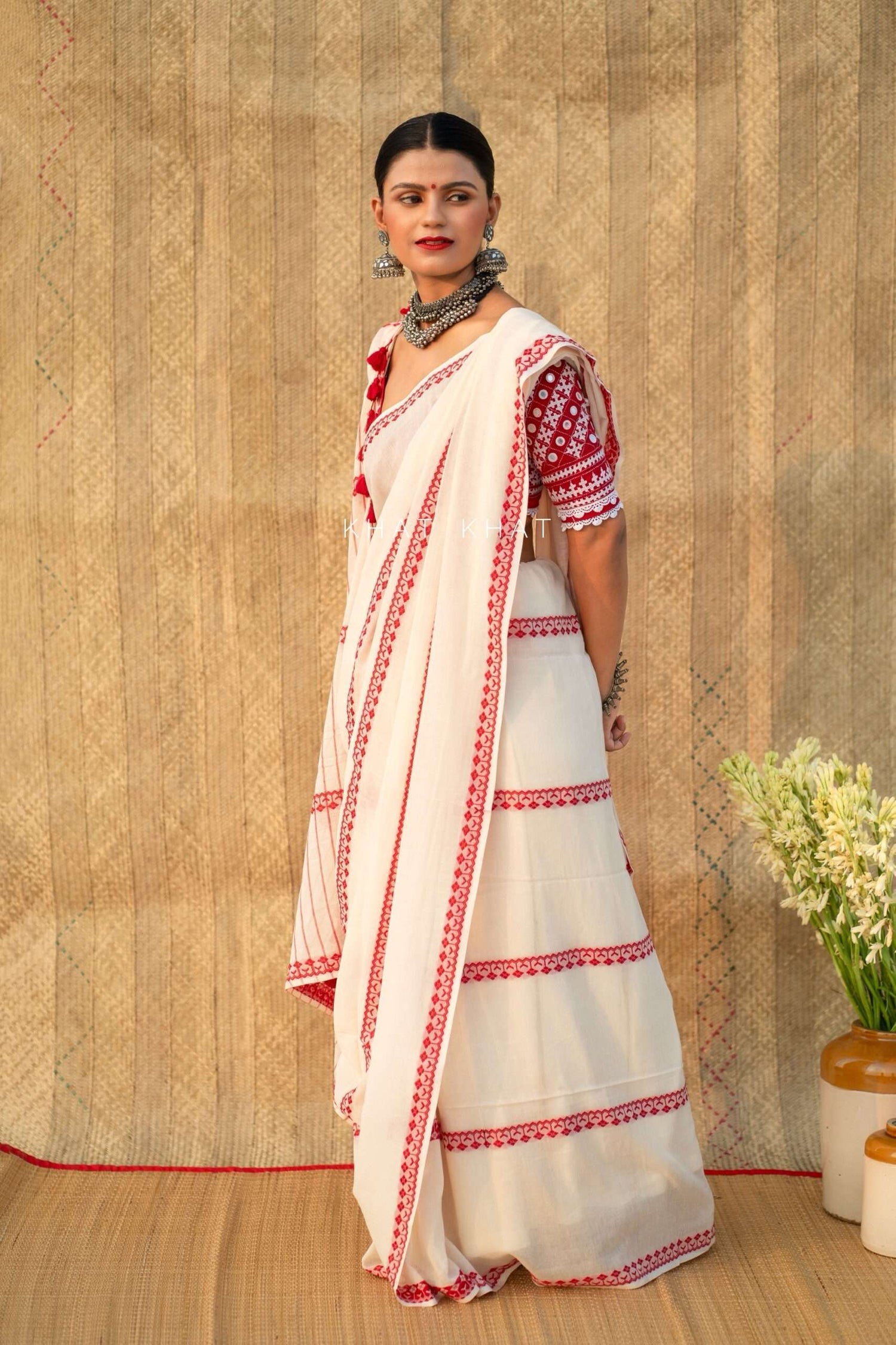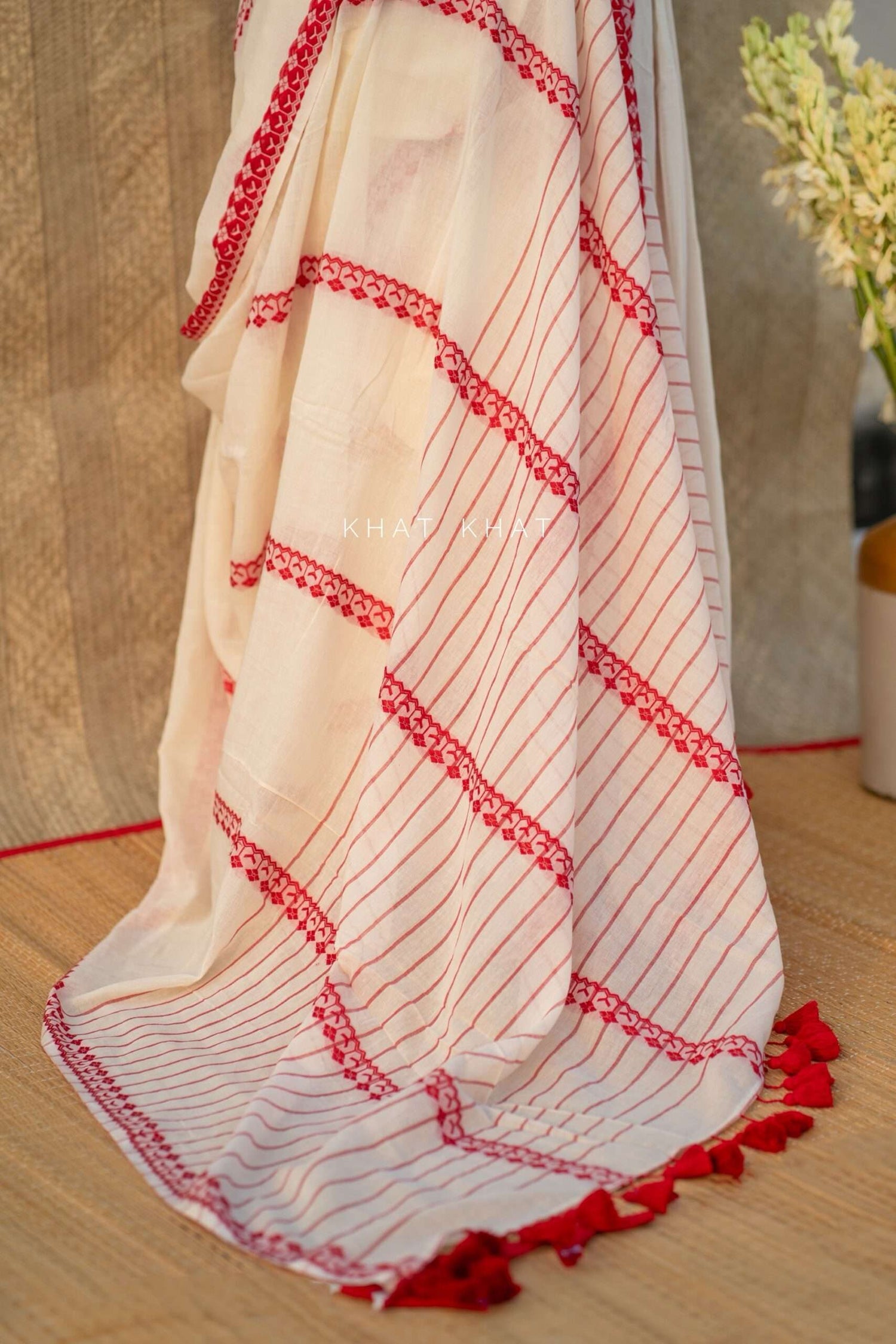 KHAT KHAT sarees are handcrafted using age-old weaving techniques passed down through generations. Each saree carries the essence of our artisans’ hard work and emotional connection to their craft, making every piece unique and full of character.