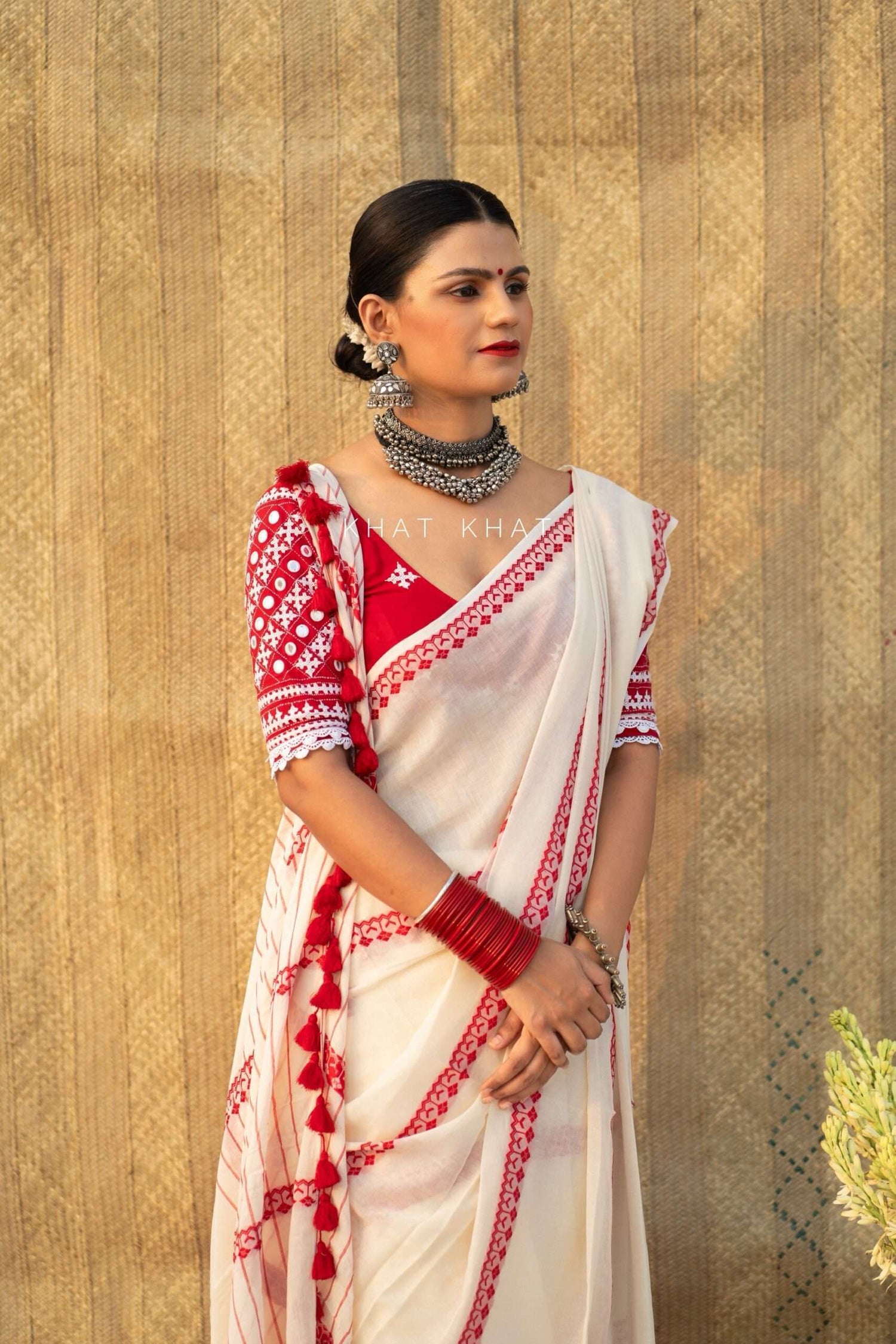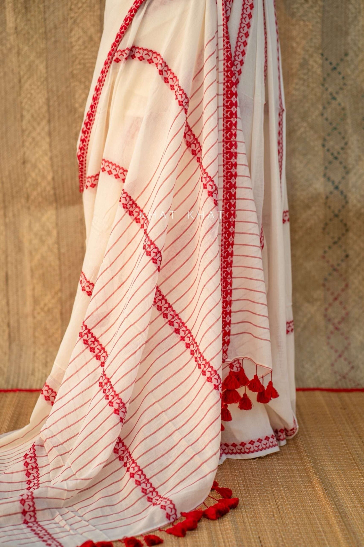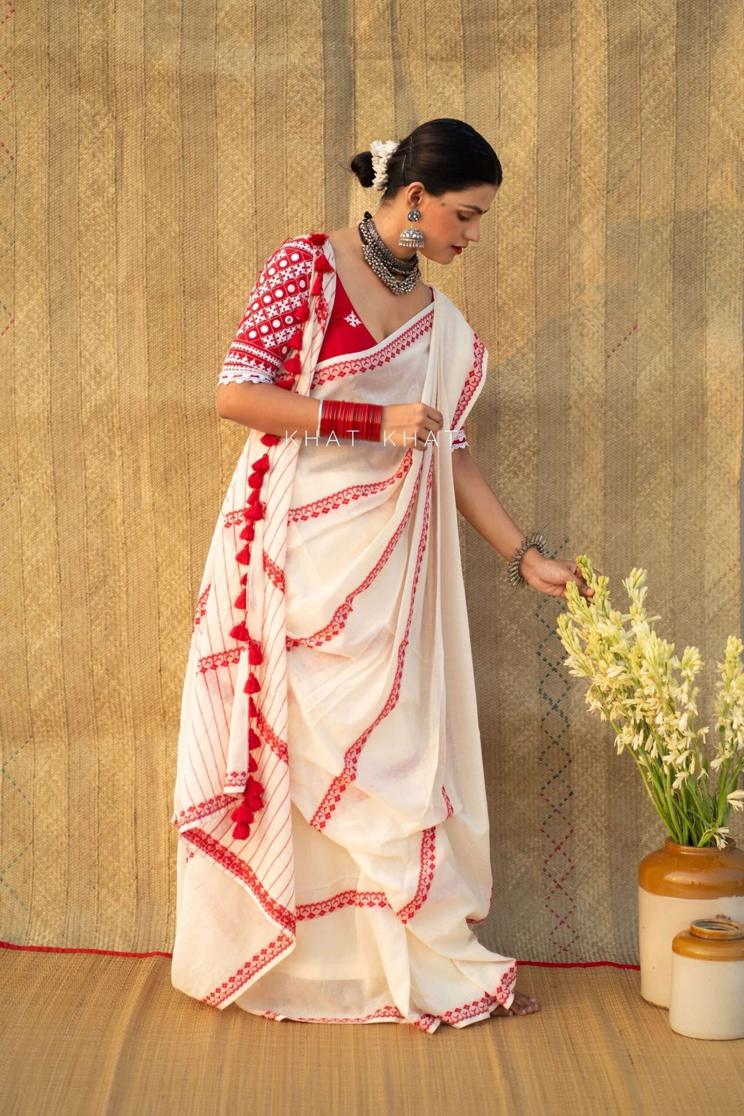 KHAT KHAT sarees are handcrafted using age-old weaving techniques passed down through generations. Each saree carries the essence of our artisans’ hard work and emotional connection to their craft, making every piece unique and full of character.
