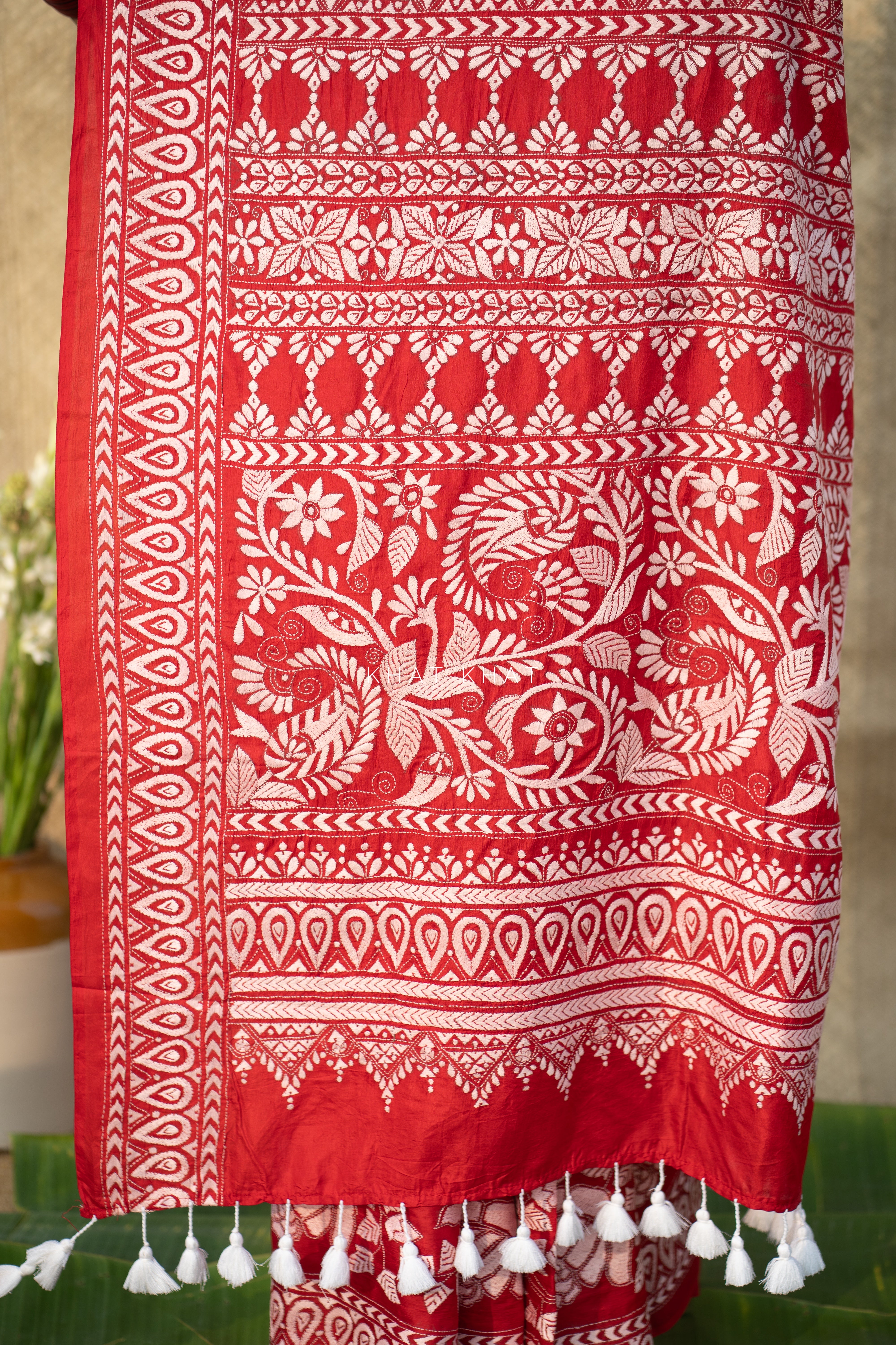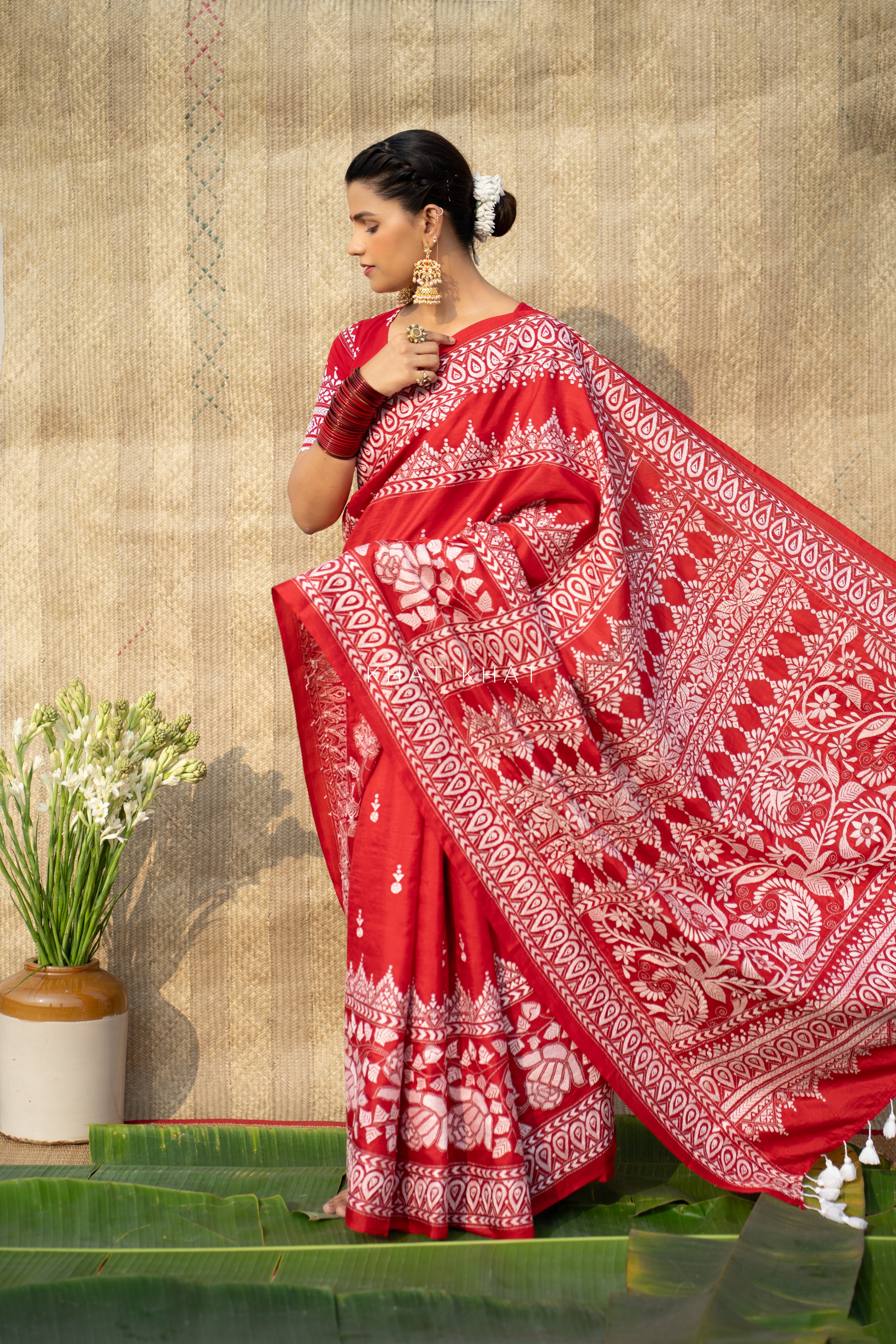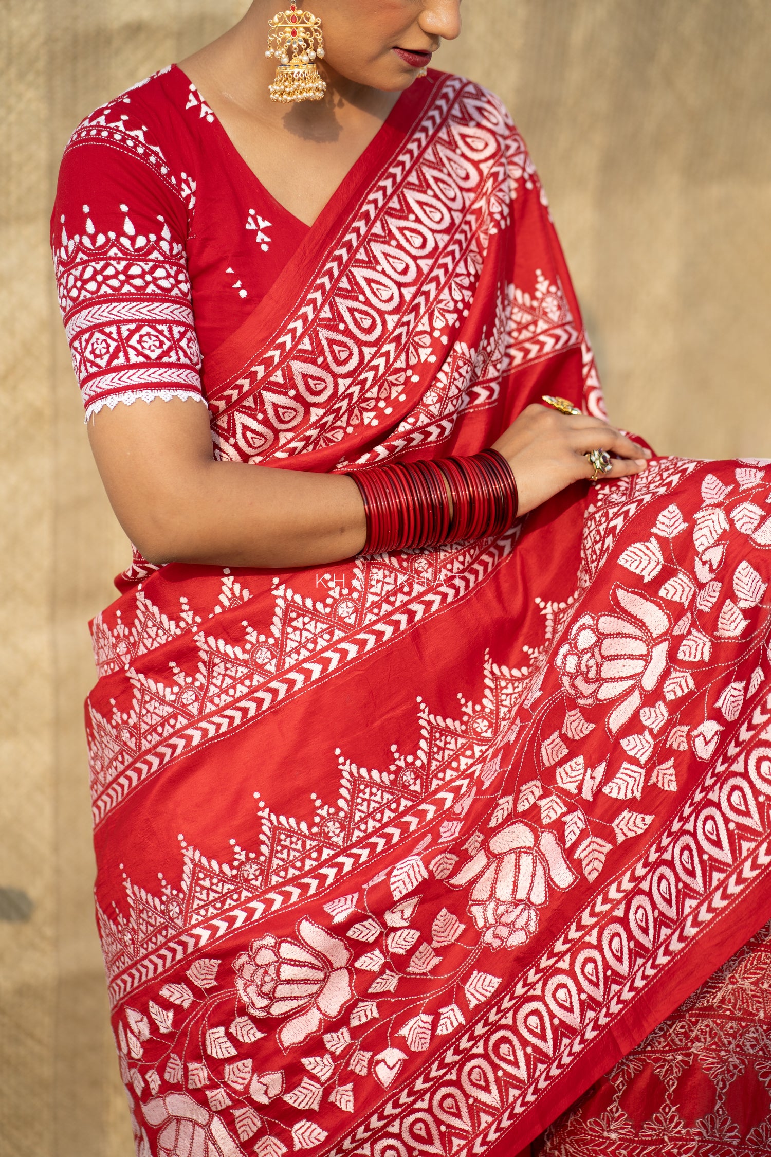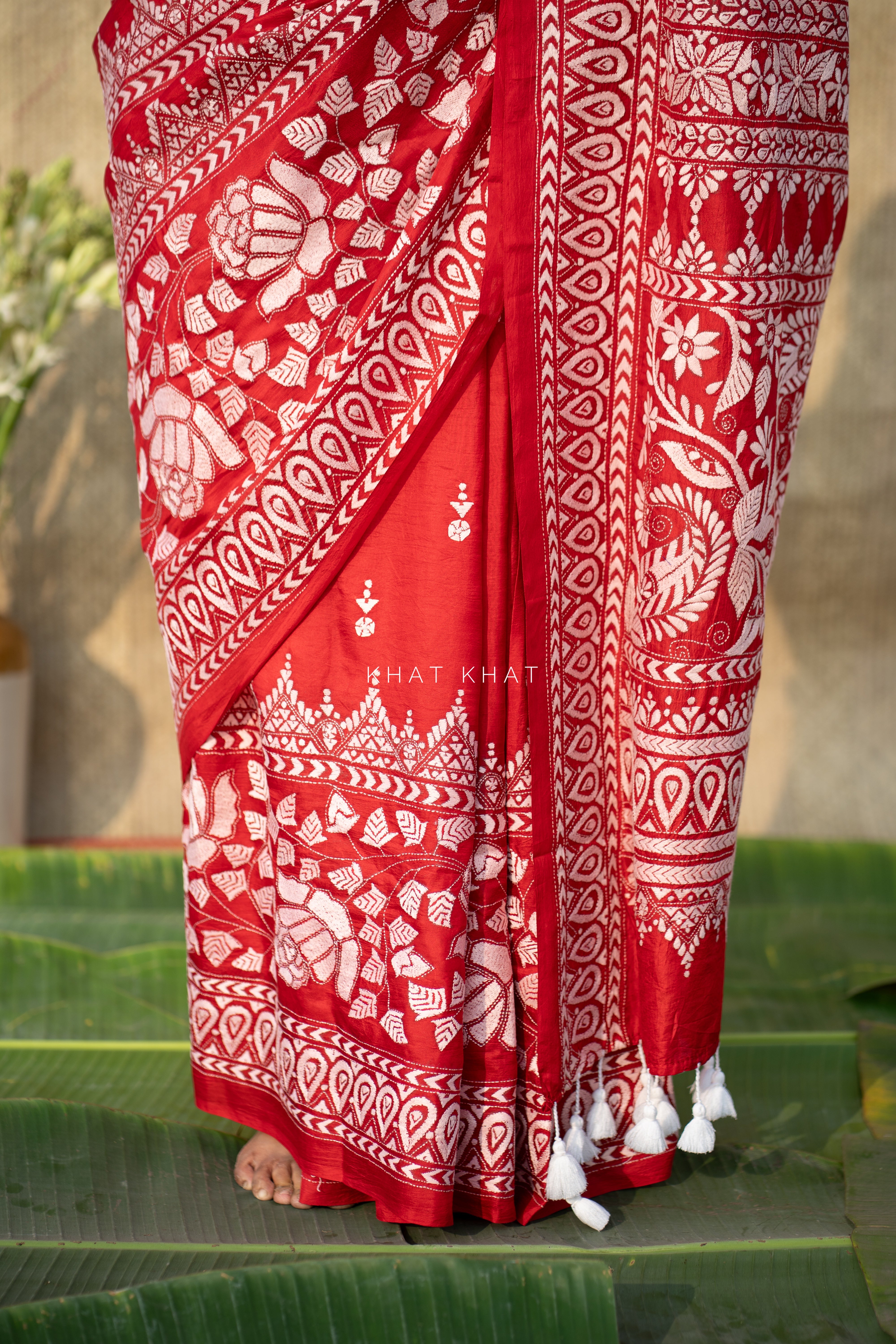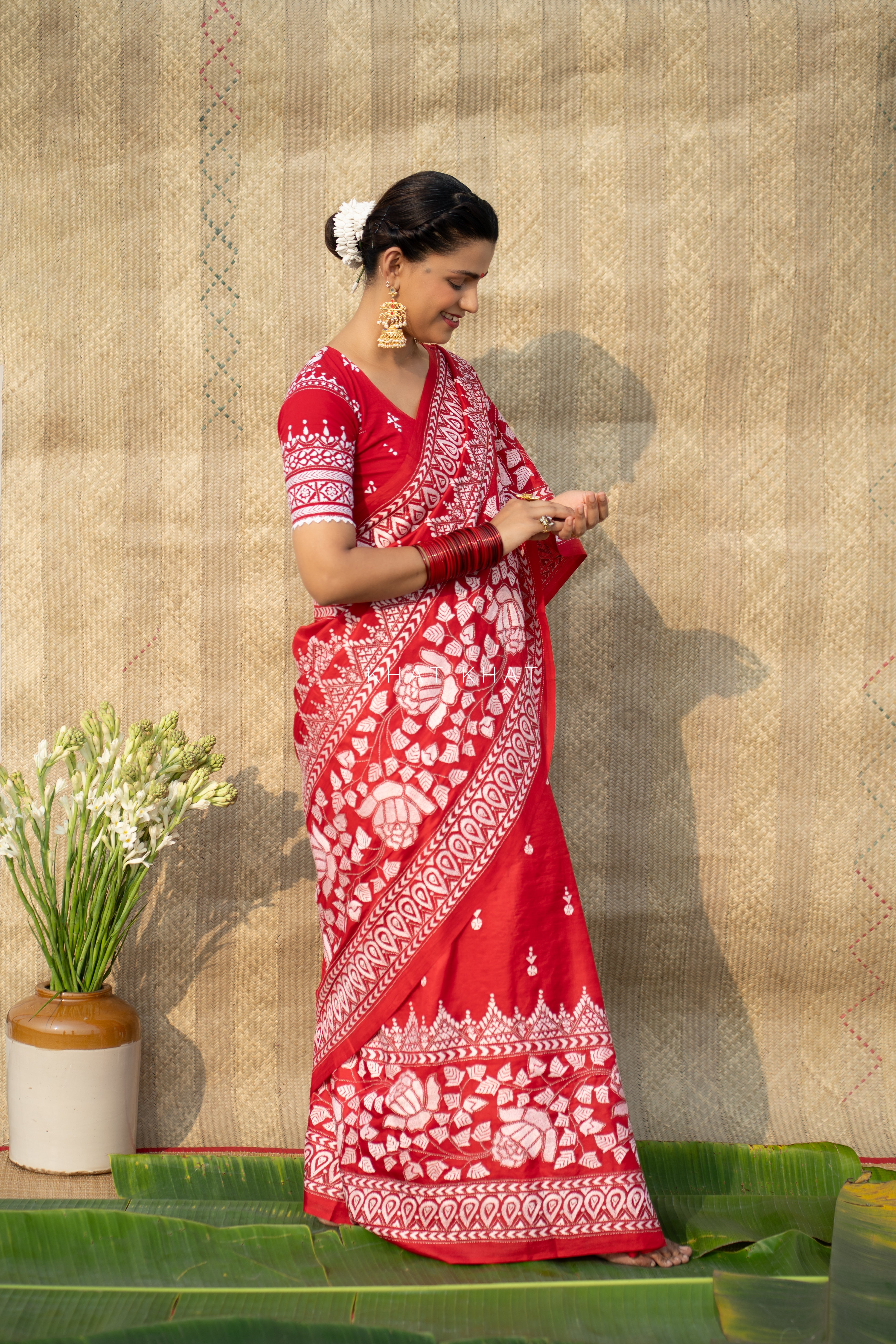 KHAT KHAT sarees are handcrafted using age-old weaving techniques passed down through generations. Each saree carries the essence of our artisans’ hard work and emotional connection to their craft, making every piece unique and full of character.