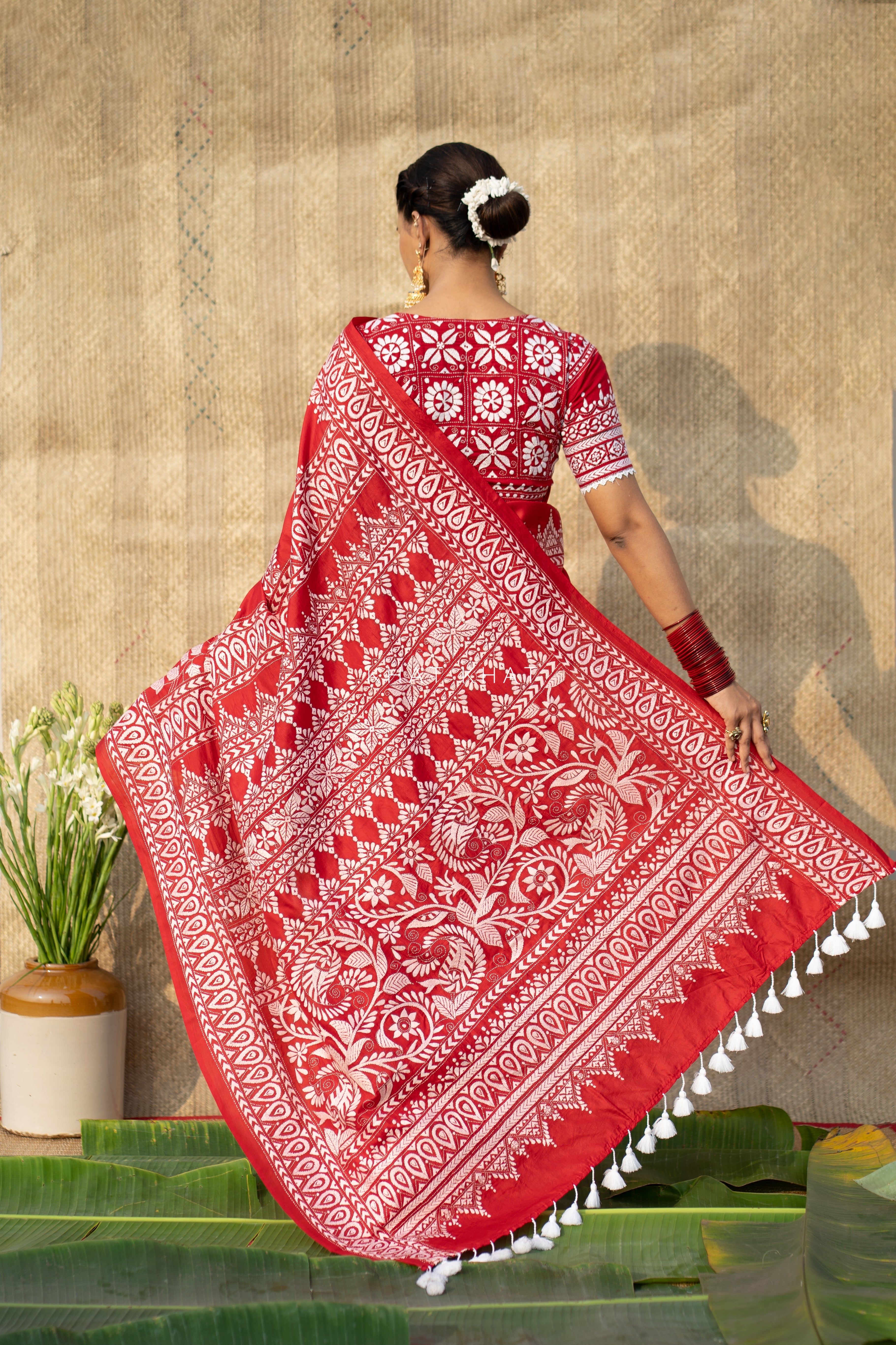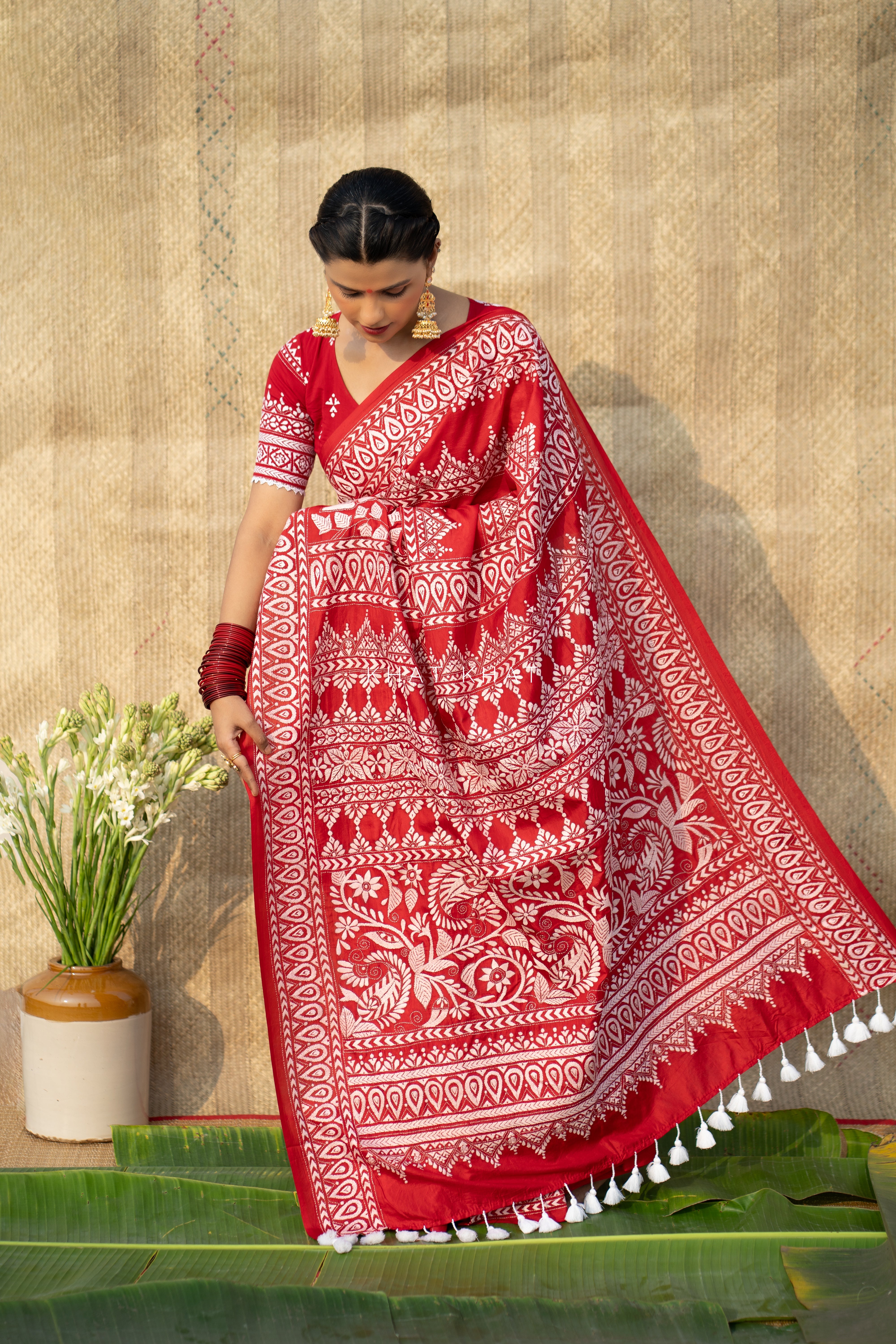 Our sarees are made from completely organic fabrics such as pure cotton, silk, and linen. Every piece is handwoven by indigenous artisans, ensuring a blend of tradition, quality, and sustainability.