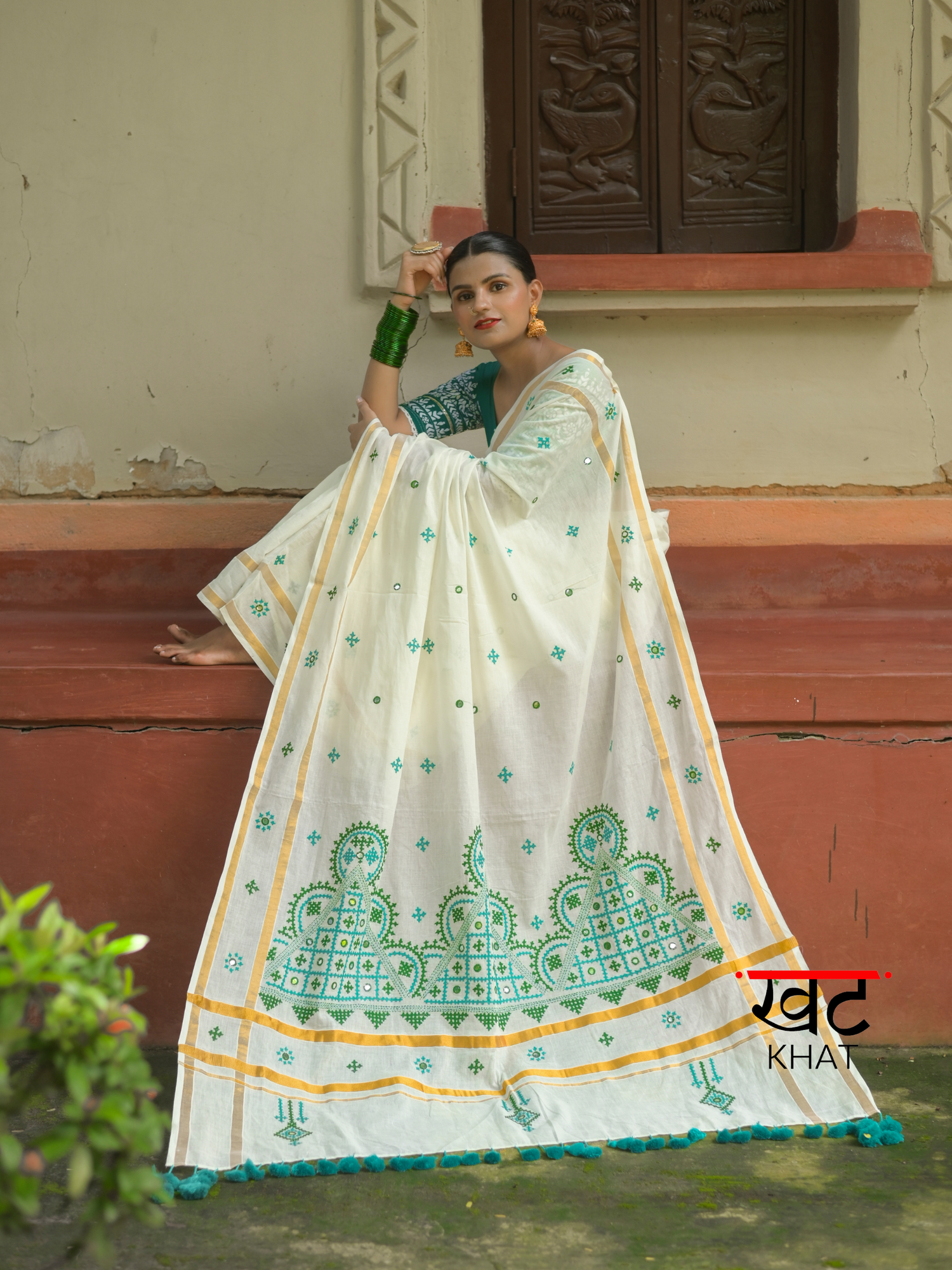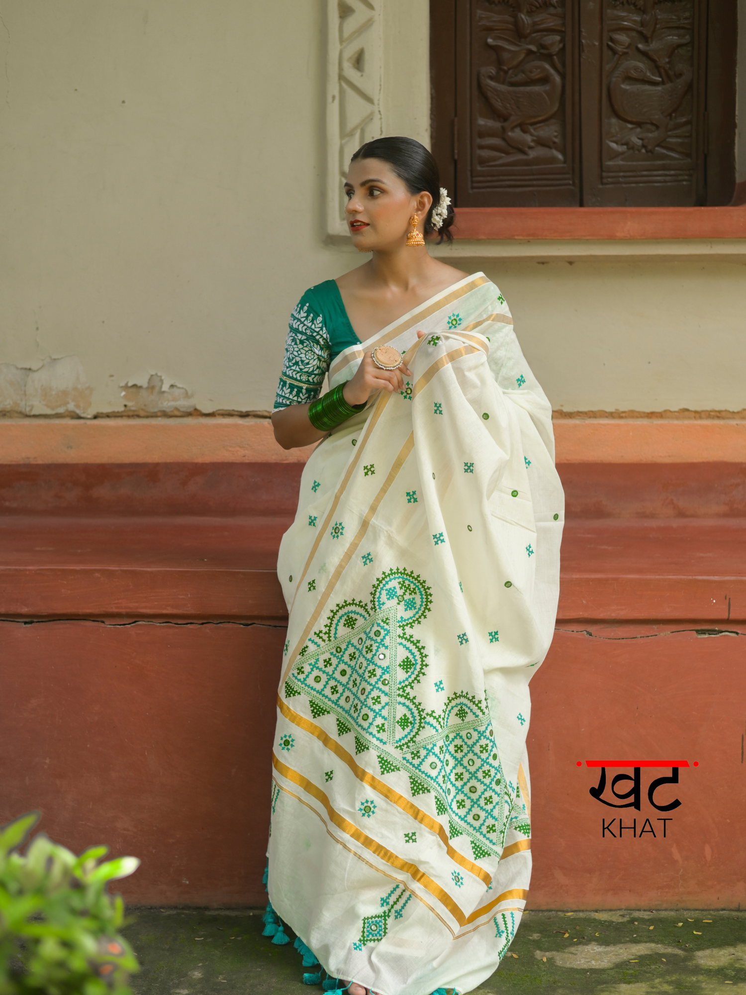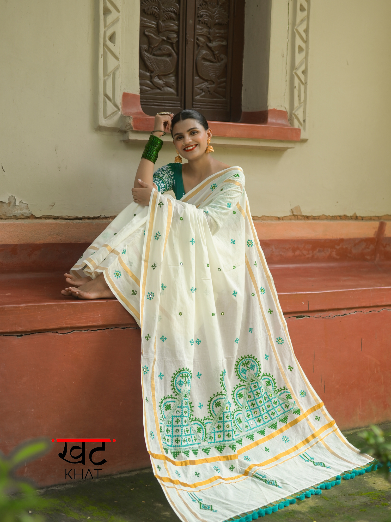 KHAT KHAT sarees are handcrafted using age-old weaving techniques passed down through generations. Each saree carries the essence of our artisans’ hard work and emotional connection to their craft, making every piece unique and full of character.