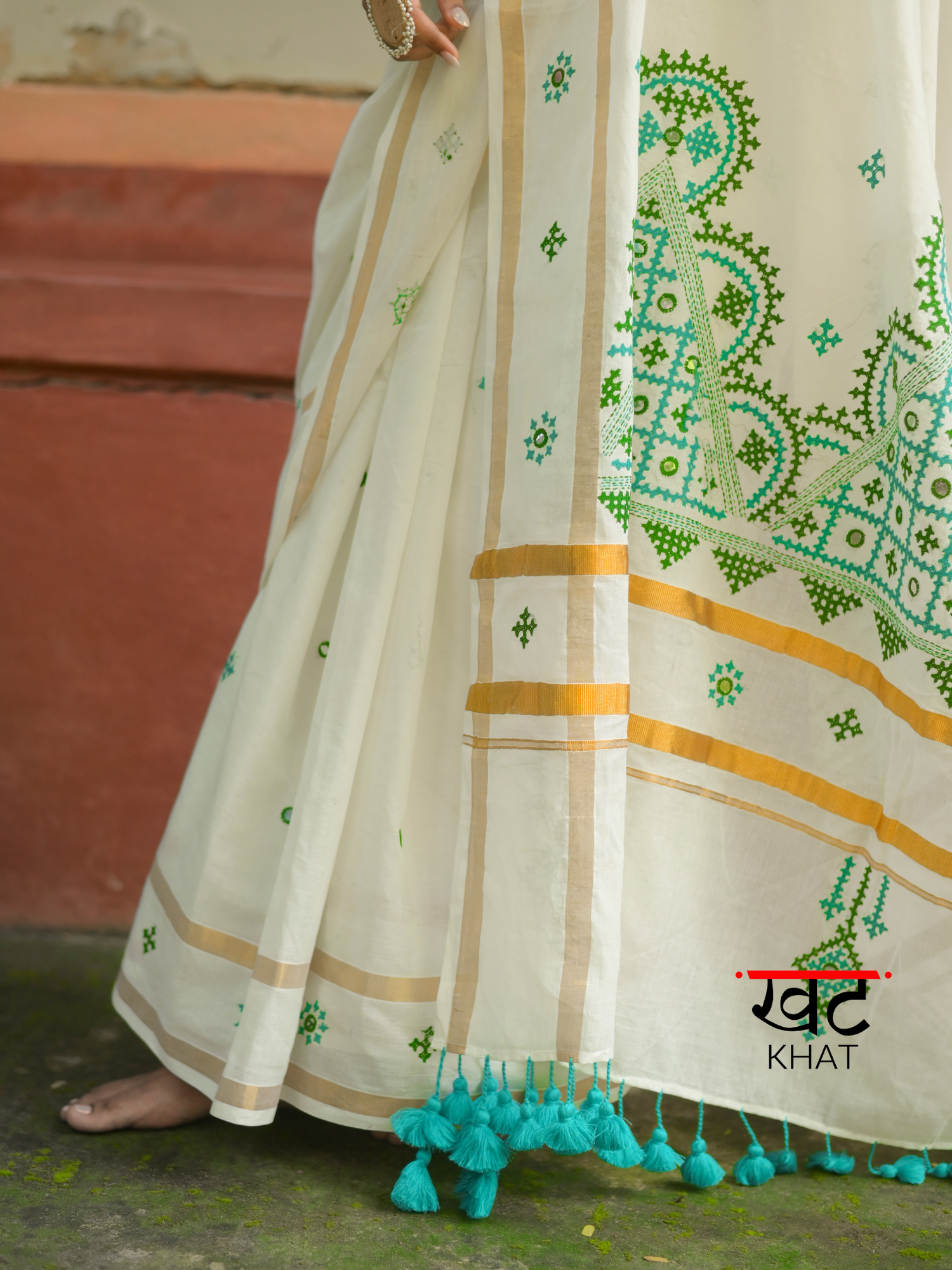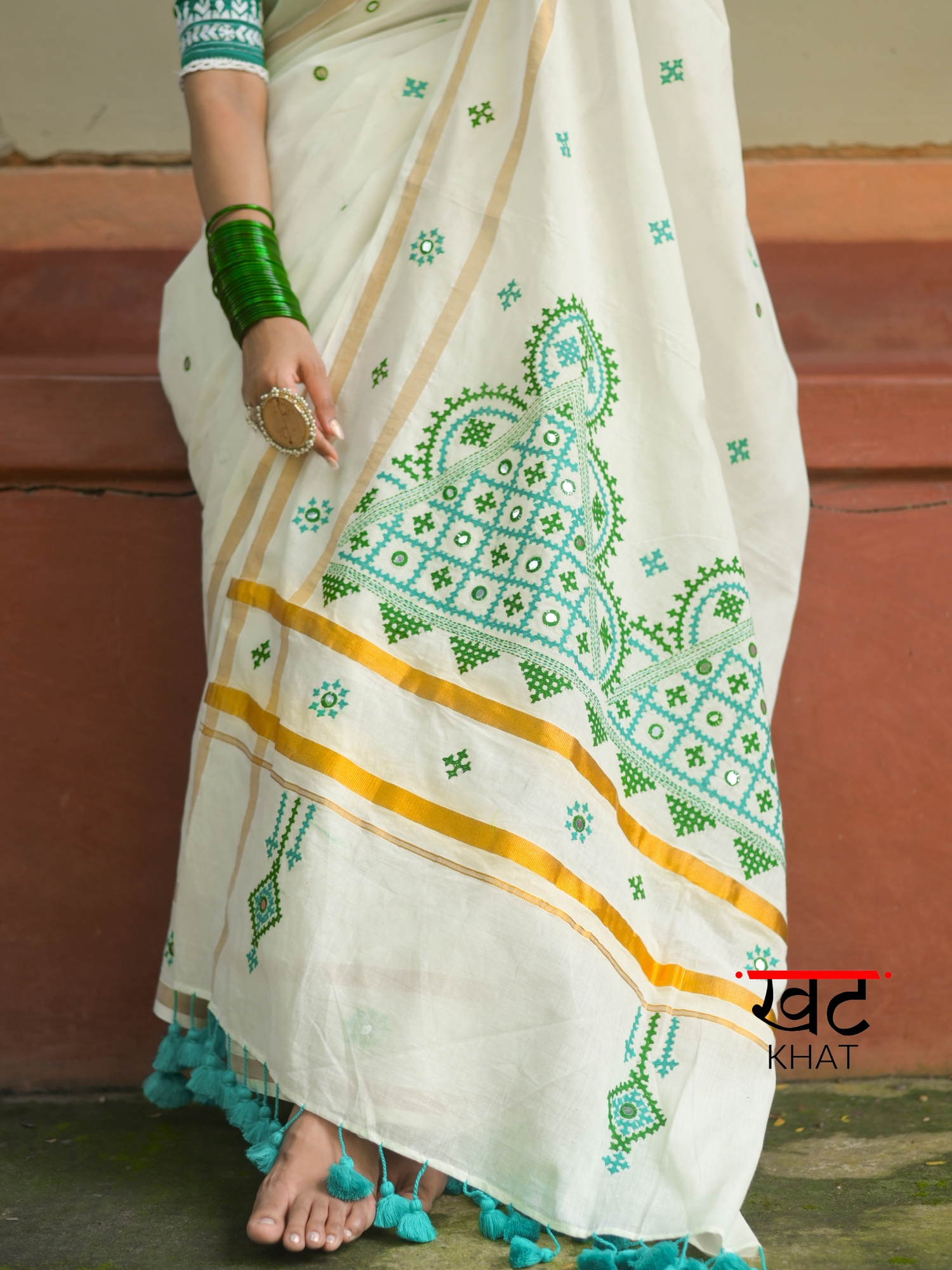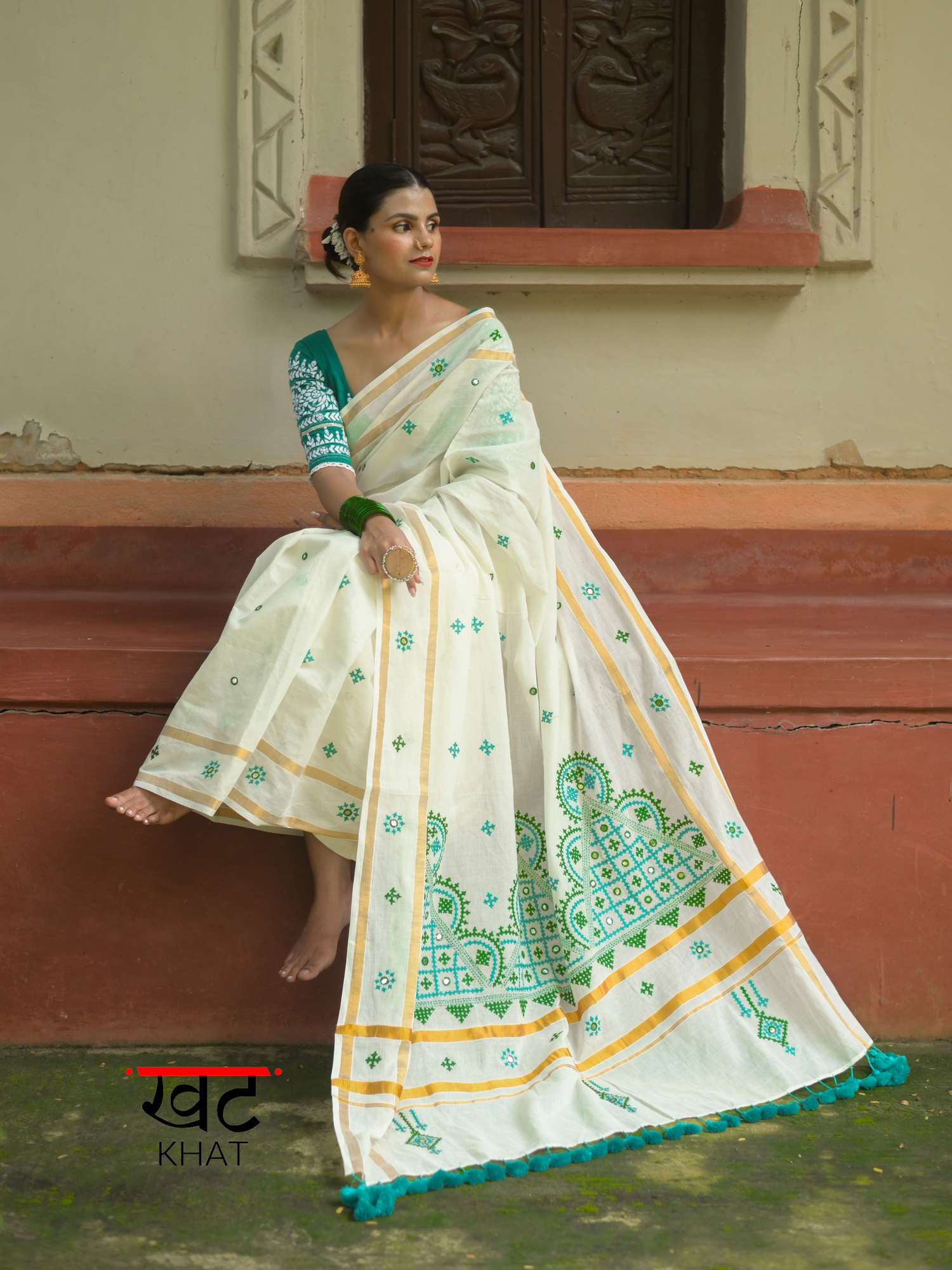 KHAT KHAT sarees are handcrafted using age-old weaving techniques passed down through generations. Each saree carries the essence of our artisans’ hard work and emotional connection to their craft, making every piece unique and full of character.