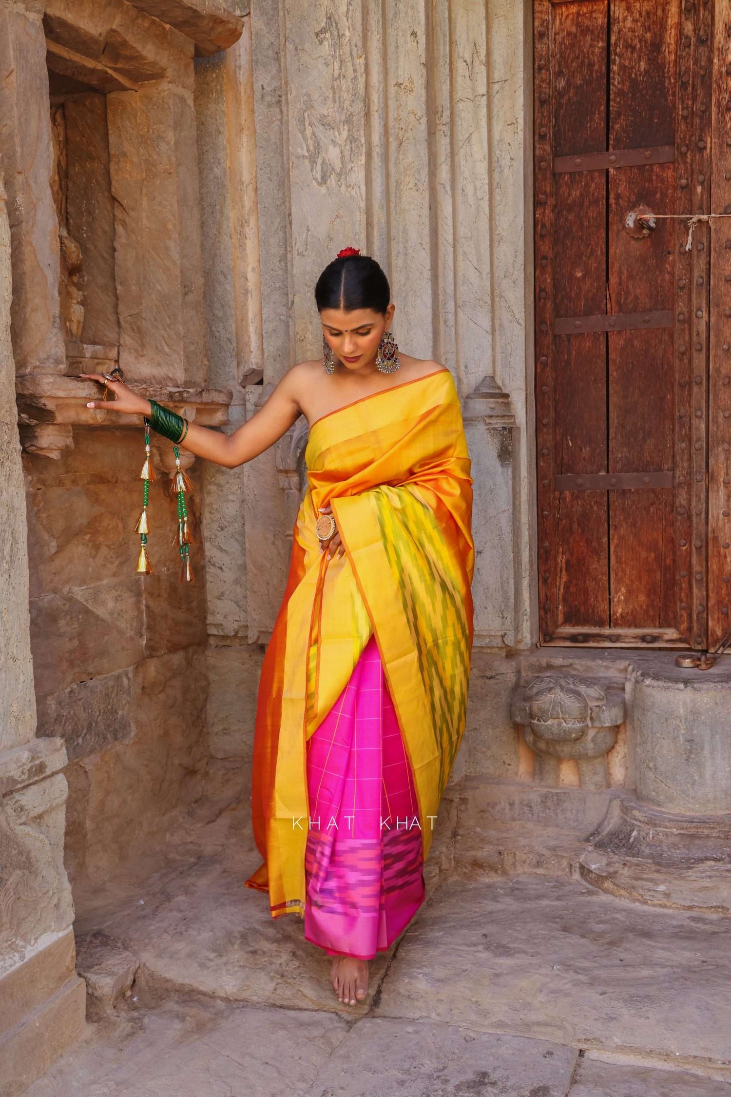 KHAT KHAT sarees are handcrafted using age-old weaving techniques passed down through generations. Each saree carries the essence of our artisans’ hard work and emotional connection to their craft, making every piece unique and full of character.