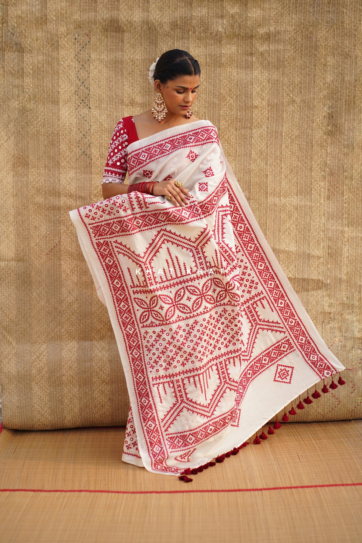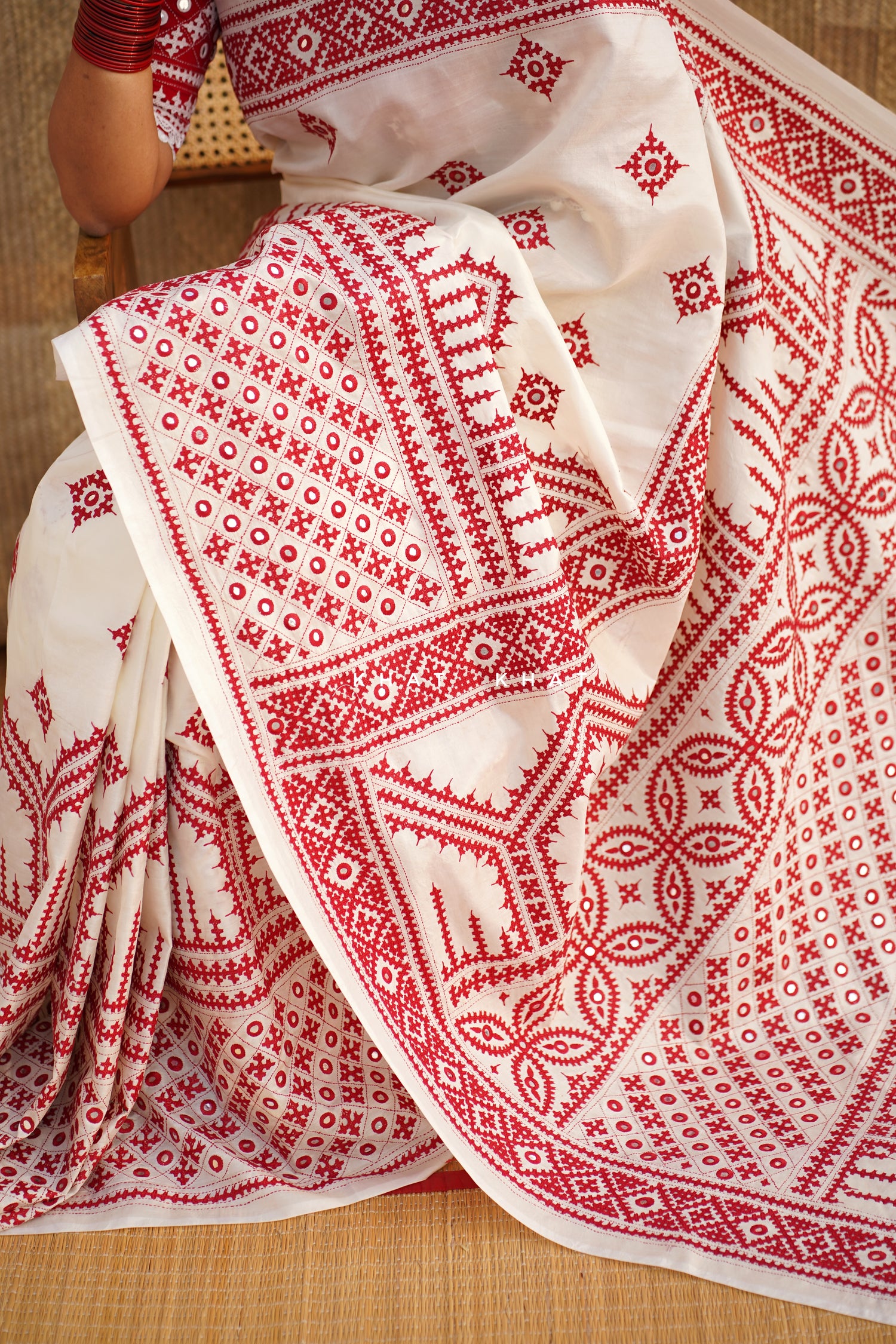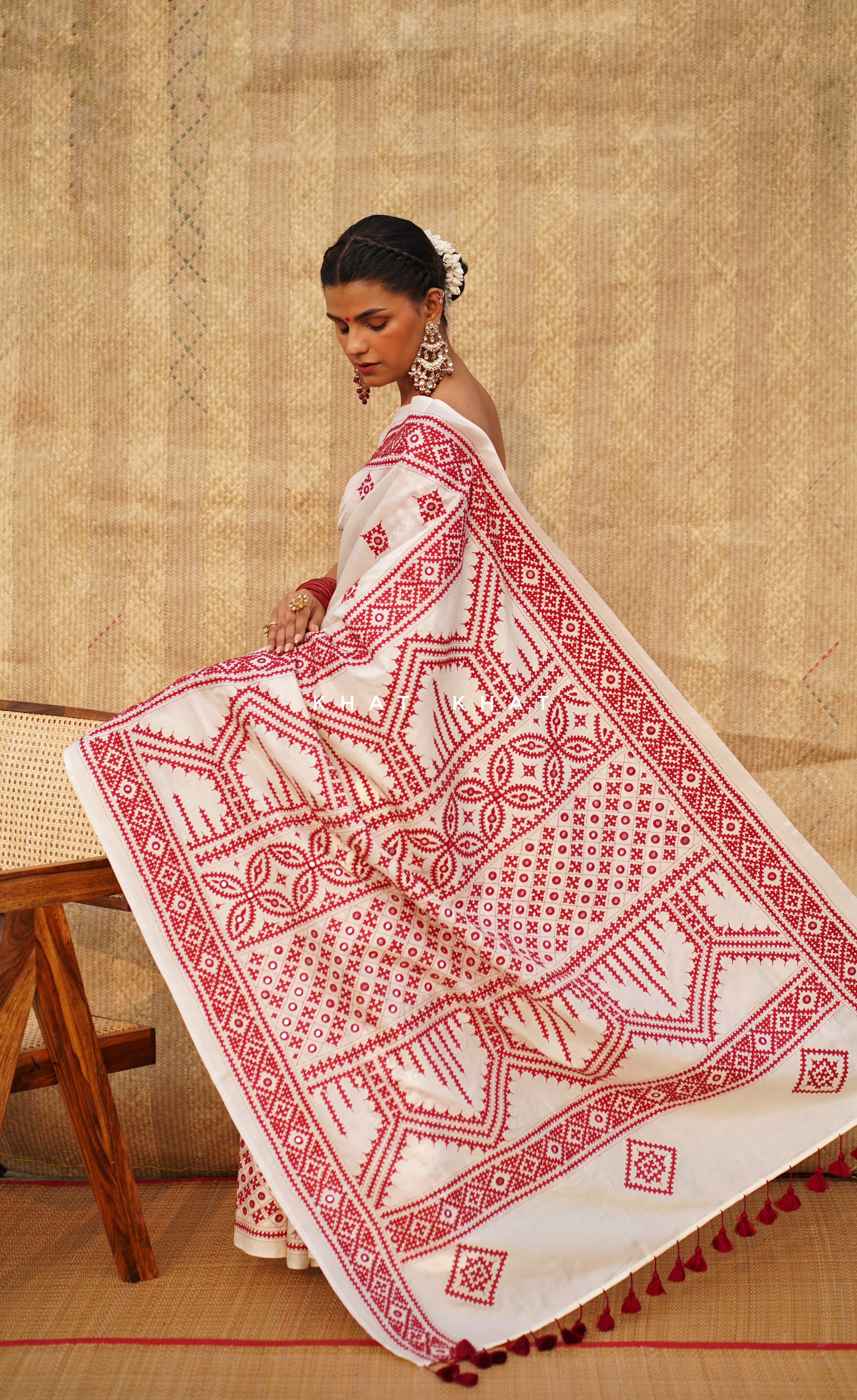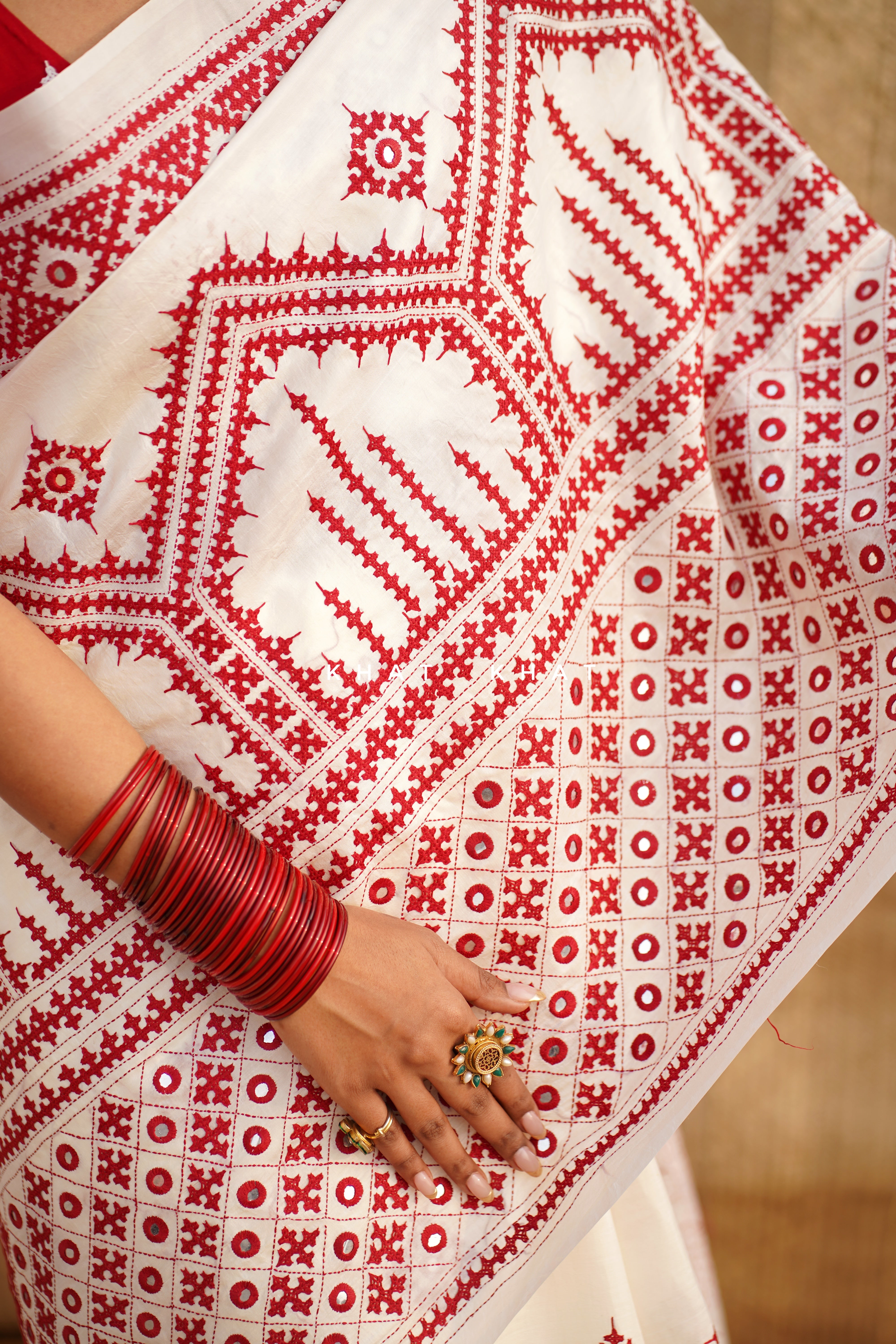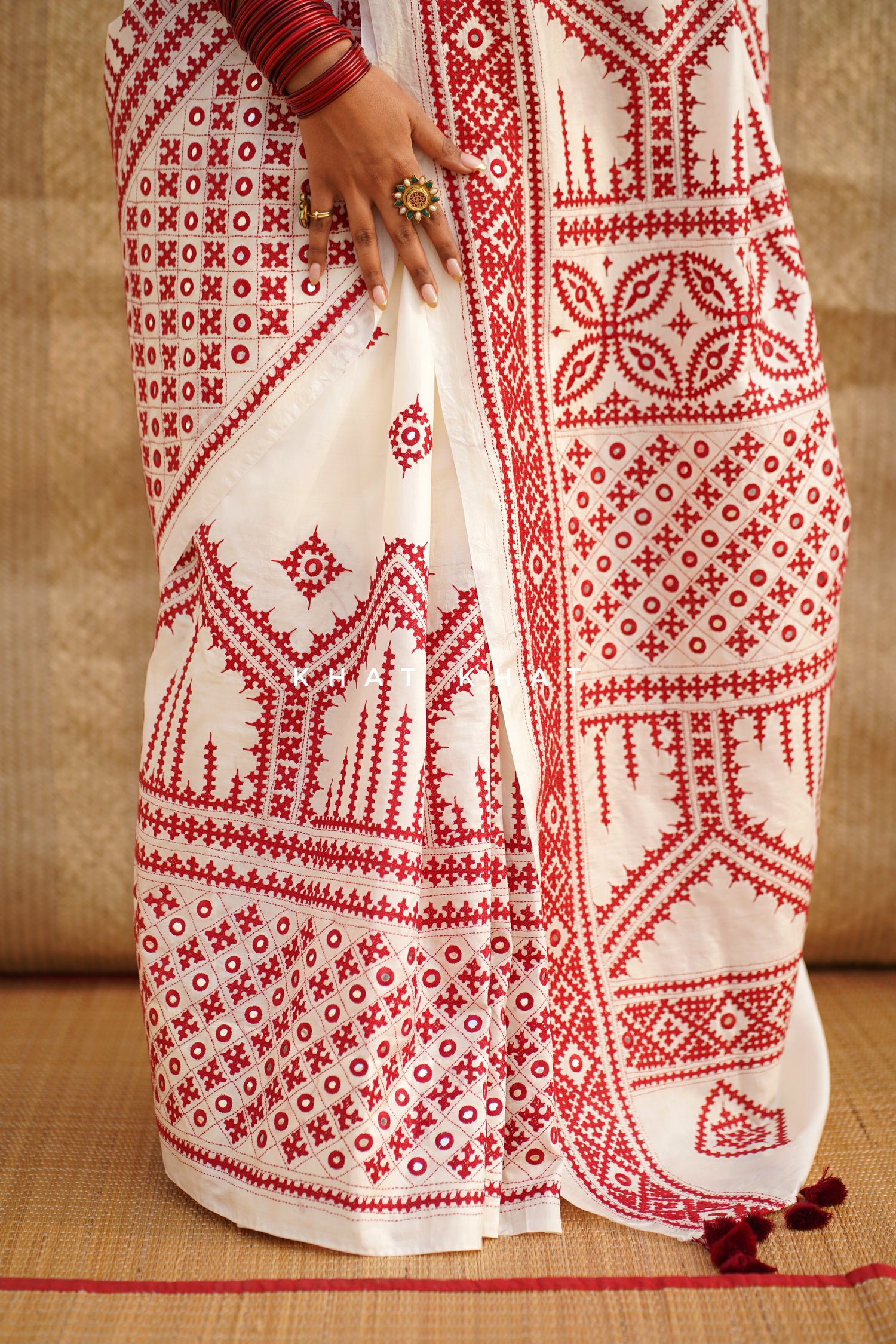 KHAT KHAT sarees are handcrafted using age-old weaving techniques passed down through generations. Each saree carries the essence of our artisans’ hard work and emotional connection to their craft, making every piece unique and full of character.