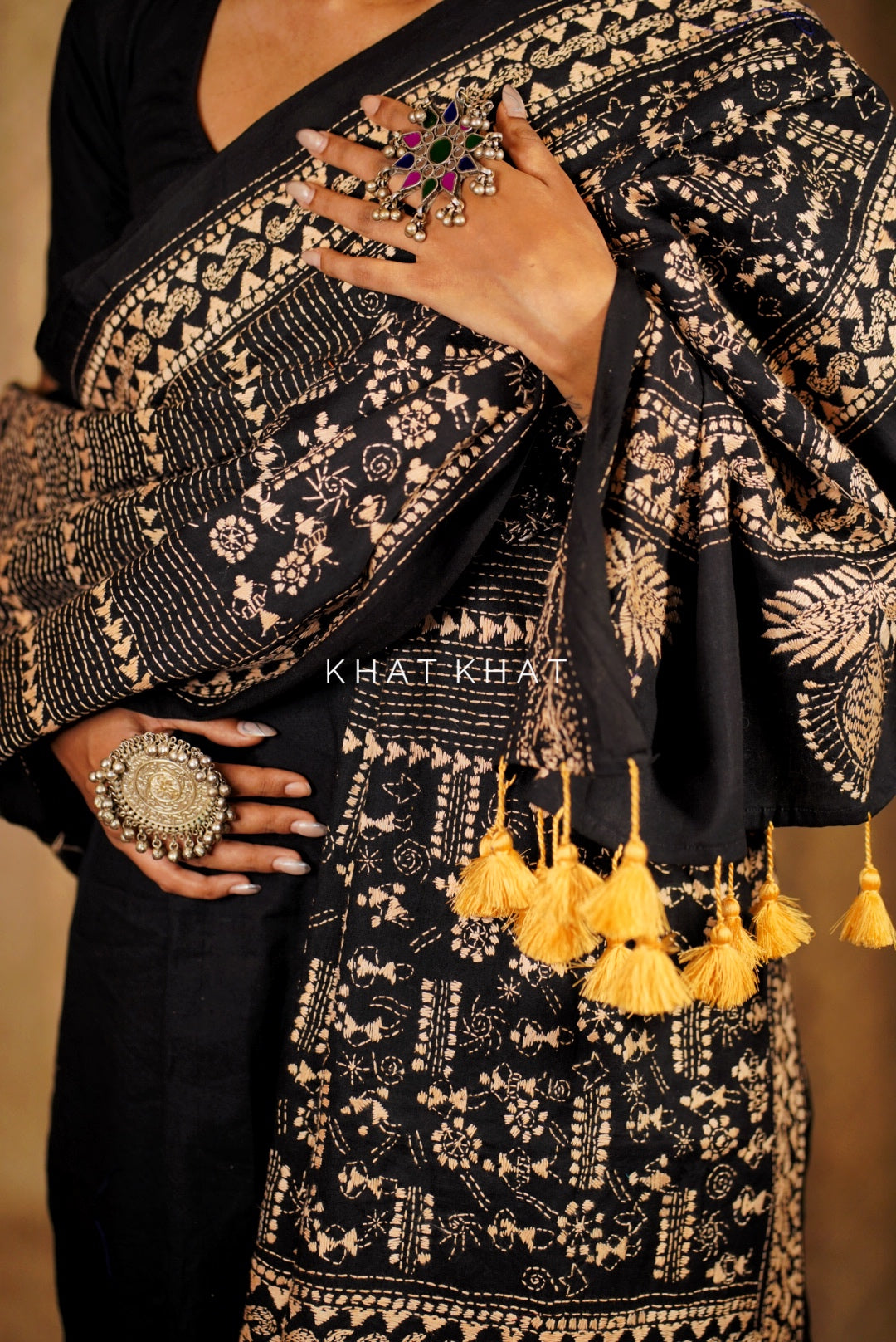 KHAT KHAT sarees are handcrafted using age-old weaving techniques passed down through generations. Each saree carries the essence of our artisans’ hard work and emotional connection to their craft, making every piece unique and full of character.