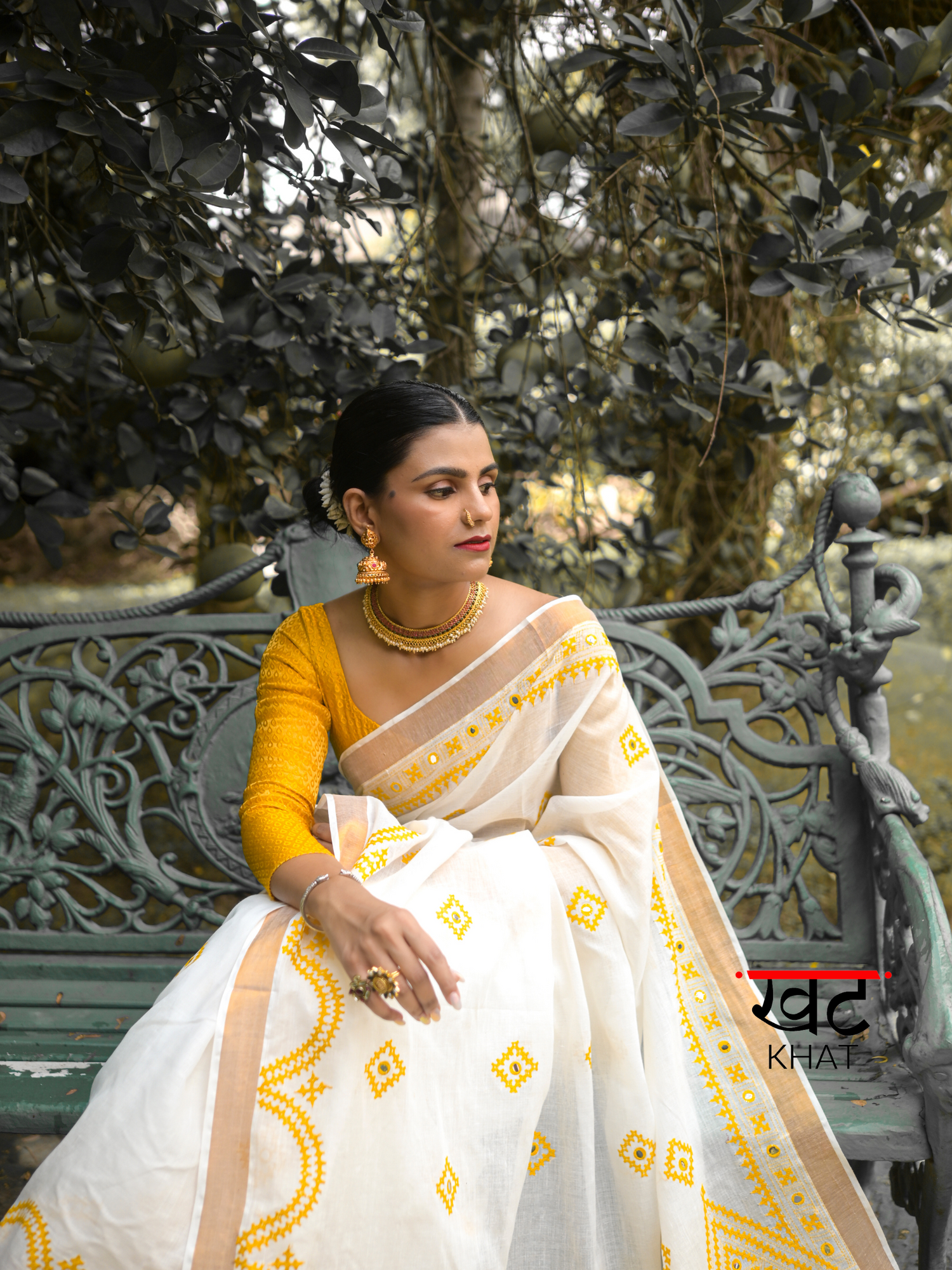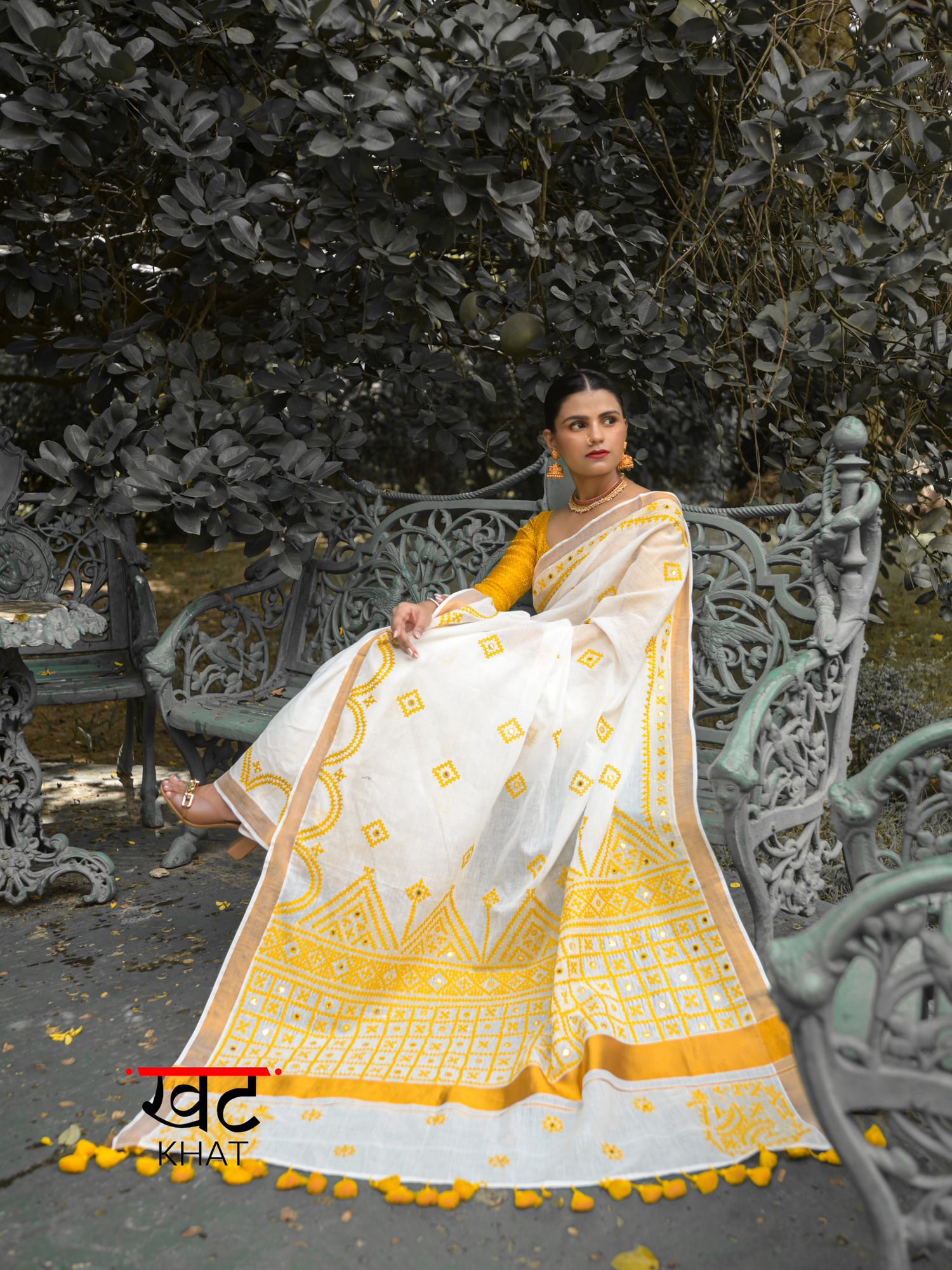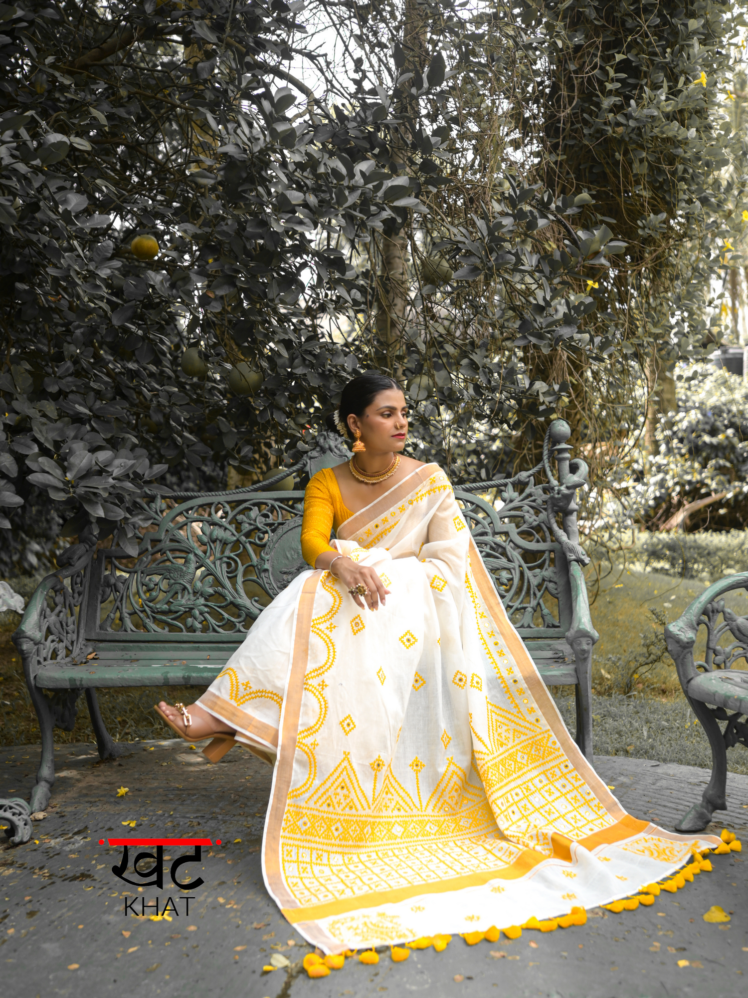 KHAT KHAT sarees are handcrafted using age-old weaving techniques passed down through generations. Each saree carries the essence of our artisans’ hard work and emotional connection to their craft, making every piece unique and full of character.