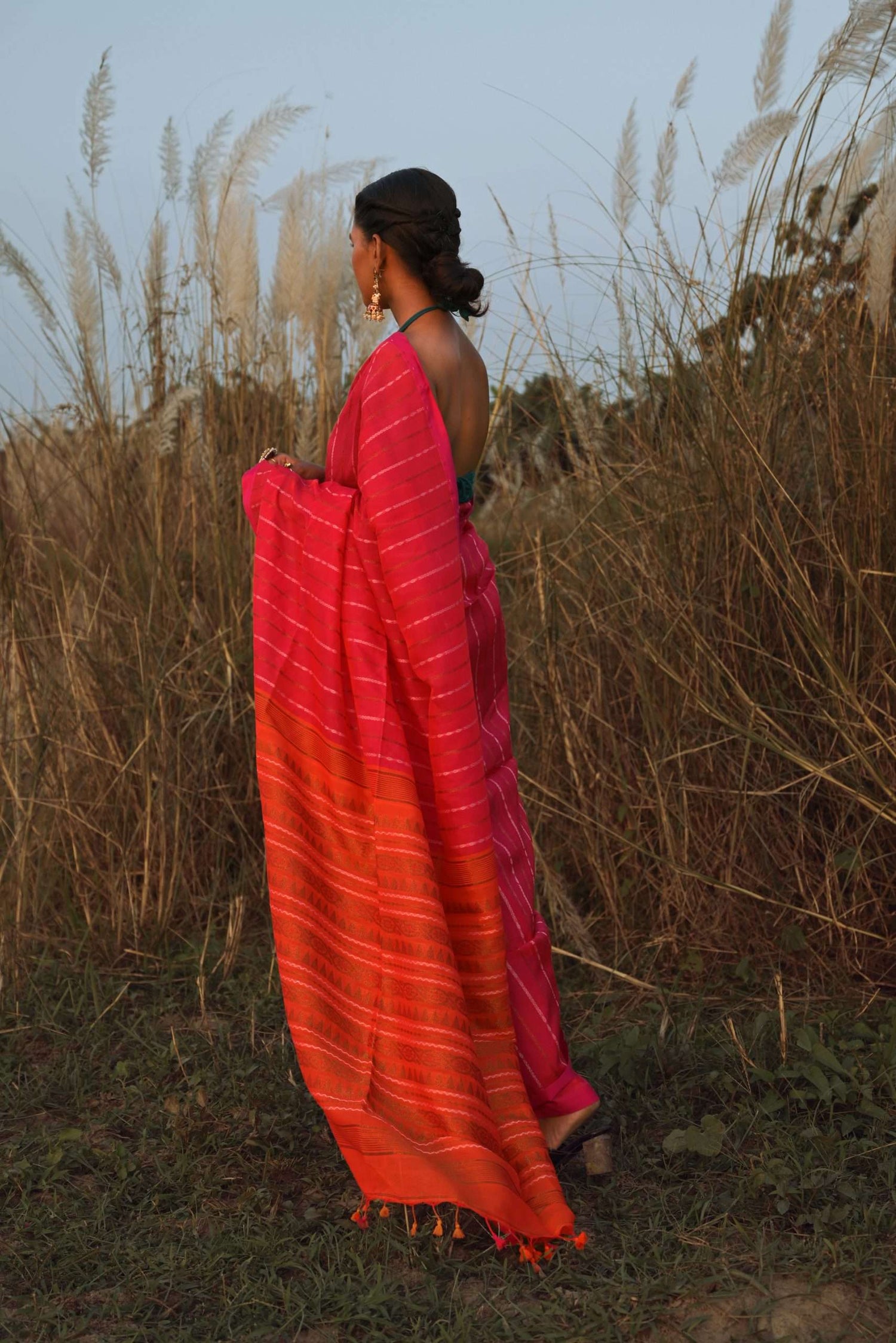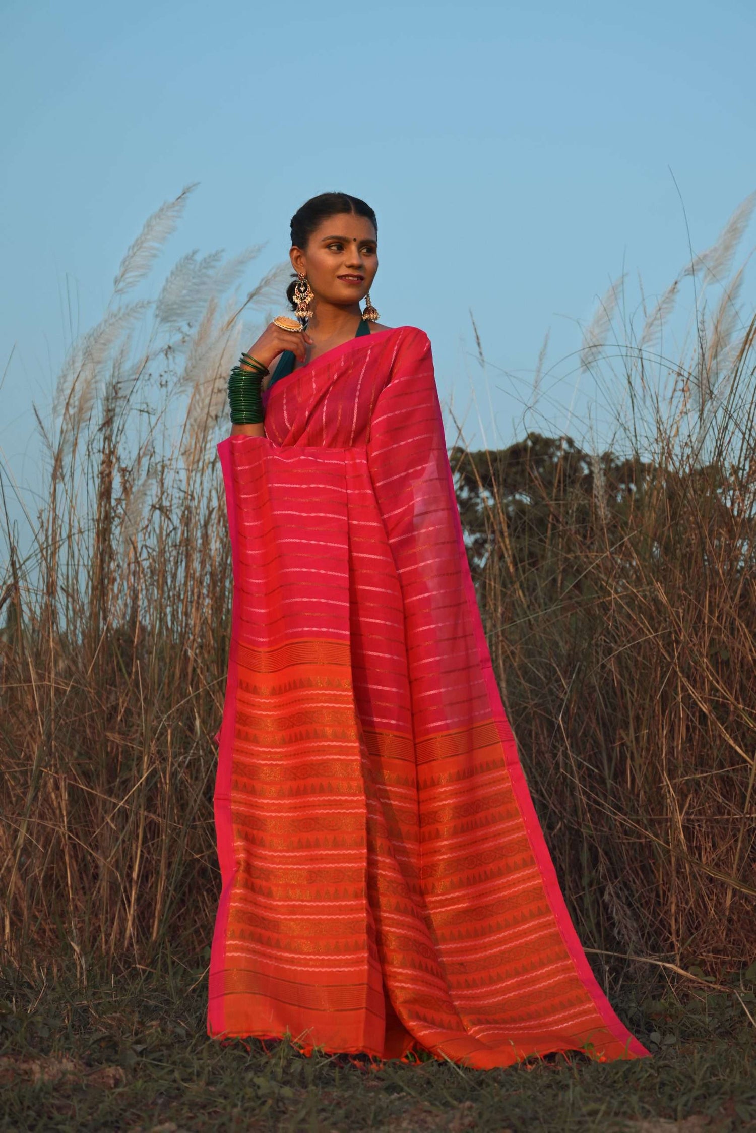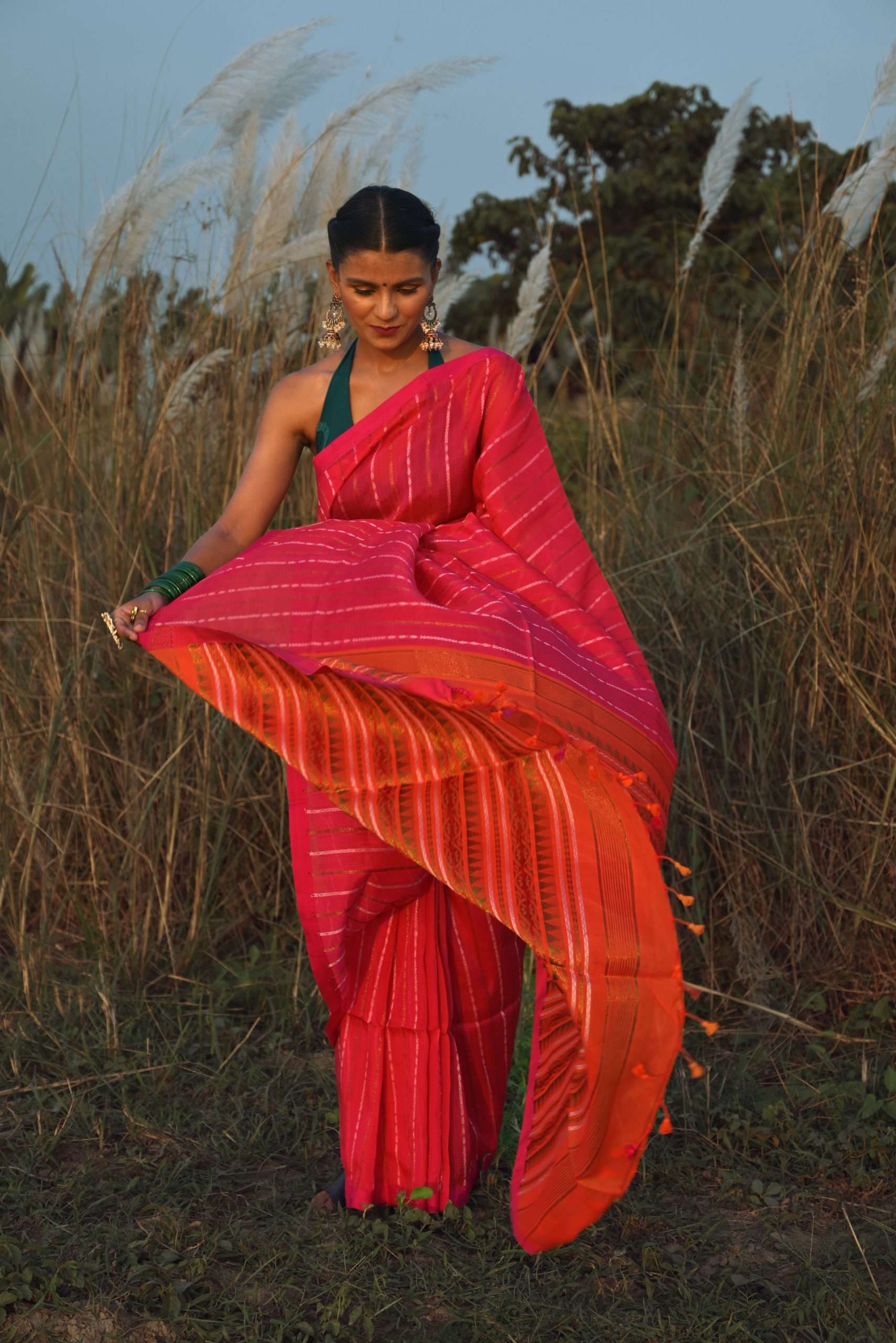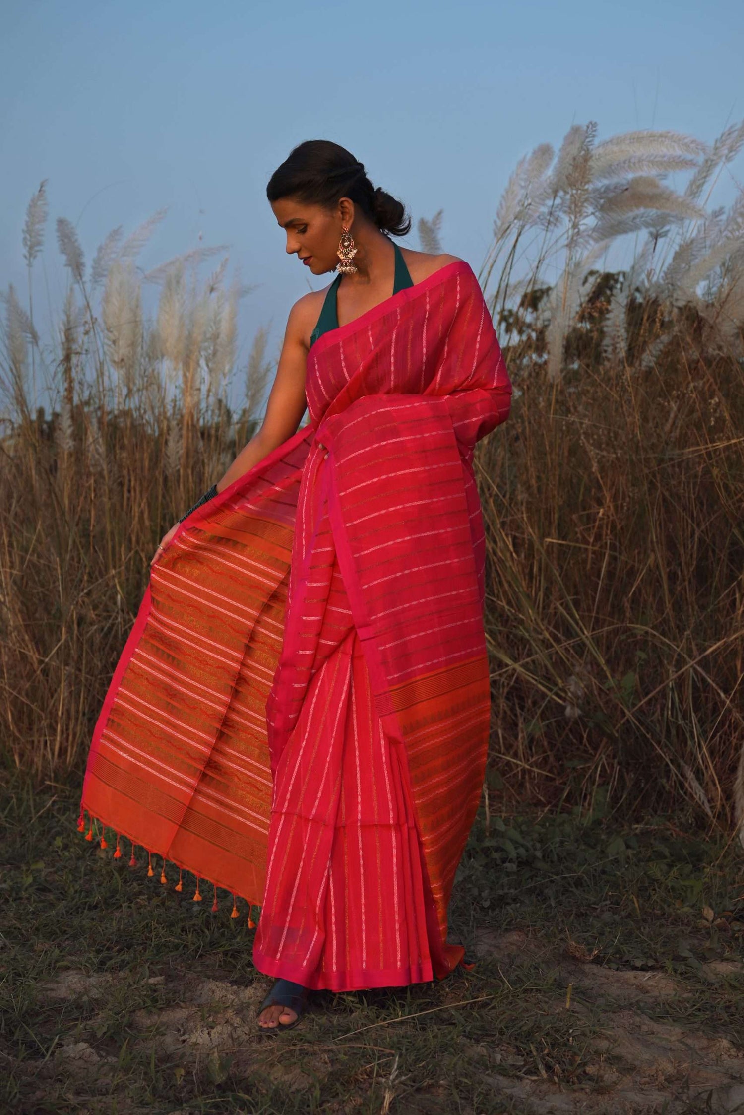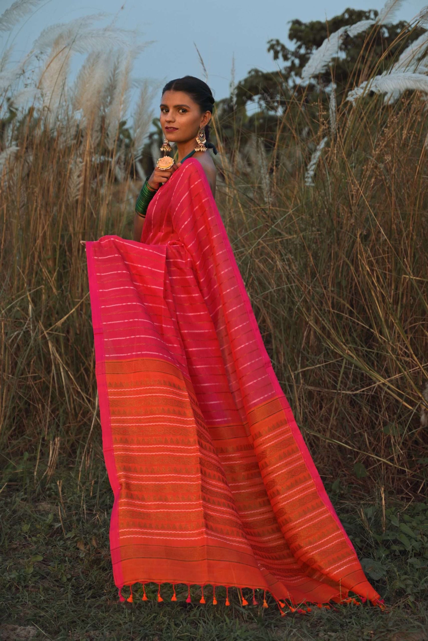 Our sarees are made from completely organic fabrics such as pure cotton, silk, and linen. Every piece is handwoven by indigenous artisans, ensuring a blend of tradition, quality, and sustainability.